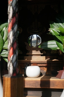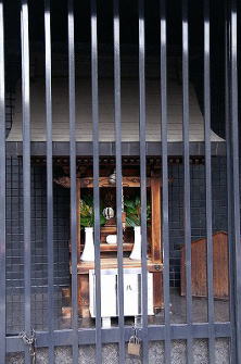 ![]() ![]() ![]() ![]() 祠はビル壁に埋め込まれており、前面には柵がある。 |