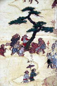 ![]() ![]() 由来の石板 ![]() 弁(瓣)慶石 ![]() 【参照】室町時代後期の「上杉本洛中洛外図屏風」に描かれた弁慶石、鴨川二条大橋の説明板より |