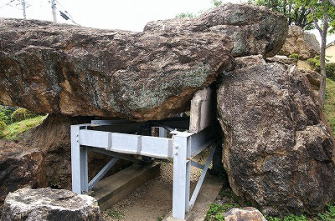 ![]() 正面、南に開いている羨道部分は鉄枠で補強されている。 ![]() 側面(東)から見た全景、玄室(右)部分は高くなっている。 ![]() 【参照】古墳全景(京都市考古資料館-京都市埋蔵文化財研究所の案内板より) |