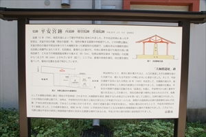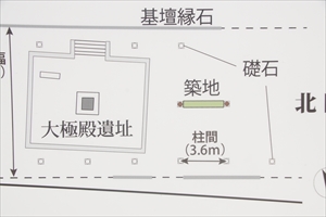 千本丸太町交差点北西の内野児童公園内に、「大極殿遺蹟(たいごくでん-いせき)」という巨大な石碑が立つ。 平安時代、794年の平安京遷都に際し、南北の大通りだった朱雀大路(現在の千本通)を中心とし、この付近に朝堂院がありその正殿である大極殿も置かれた。 朝堂院の西には、饗宴施設である豊楽院、北東に天皇の居所内裏があった。ほか二官八省の官衙が建ち並び、内裏の西に宴松原という空間があった。 ◆歴史年表 奈良時代、793年、大極殿の建設が始まる。 平安時代、794年、10月、第50代・桓武天皇は京都に移り、平安京遷都の詔を下した。11月、「山背国」から「山城国」に改めた。 795年、大極殿は完成する。その後、周囲に殿舎が建て増しされる。 796年、元日、桓武天皇は、大極殿で最初の朝賀を受けた。 806年、造都事業は中止される。 815年、大極殿の大掛かりな修理が行われている。 876年、大極殿が焼失した。(第一次大極殿) 879年、再建される。 880年、地震により基壇北西隅が破損した。 899年、台風により大極殿内の高御座が傾倒した。 1057年、鴟尾が落下する。 1058年、大極殿が焼失した。(第二次大極殿) 1072年、大極殿が再建される。 1157年、大内裏が修造される。大極殿も修理される。 1177年、安元の大火で大極殿が焼失し、以後、再建されなかった。(第三次大極殿) 鎌倉時代、1212年、「火出で来て西北に至る。はてには、朱雀門・大極殿・大学寮・民部省などまで移りて」と記されている。(『方丈記』) 1227年、平安宮の火災後、内裏は再建されることはなかった。その後、跡地は荒野(内野)と化した。 安土・桃山時代、1587年、豊臣秀吉は、かつての大内裏の位置に聚楽第を築造した。 1588年、秀吉は聚楽第に第107代・後陽成天皇を迎える。 1595年、聚楽第は破却される。 近代、1895年、平安遷都1100年を記念し、「大極殿遺蹟」が建立された。 現代、1959年、平安京内初の本格的な発掘調査が、内野児童公園内で実施される。 1994年、千本通の電話線布設工事に伴う立会調査で、大極殿基壇の一部、南側の階段跡が見つかる。大極殿北端の位置が確定した。 2006年、発掘調査により、緑釉瓦が出土した。鬼瓦、鴟尾(しび)の一部は、三彩技法が用いられていることが判明する。 2008年、3月、京都市は「源氏物語ゆかりの地」の説明板を設置した。 2017年、2月、国の史跡に追加指定された。 ◆桓武 天皇 奈良時代-平安時代の第50代・桓武 天皇(かんむ-てんのう、737-806)。男性。父・白壁王(のちの第49代・光仁天皇)、母・高野新笠(たかの-の-にいがさ)は、百済の武寧王を祖先とする百済王族の末裔という。名は山部(やまべ)。皇位継承者ではなかった。772年、光仁皇后井上内親王が廃后、その子・他戸親王も廃太子され、773年、立太子された。781年、即位、同母弟・早良親王を皇太子に立てた。これらには藤原百川の画策があった。784年、平城京より長岡京遷都、785年、造長岡宮使長官・藤原種継暗殺事件に伴い、早良親王を廃太子に追う。794年、平安京再遷都した。百済王氏出自を官人などに重用、坂上田村麻呂を征夷大将軍とし、蝦夷侵略の兵を送る。最澄や空海を保護する一方、既存仏教を圧迫した。山陵は当初、宇多野(右京区)とされたが、柏原山陵(伏見区)に改められた。70歳。 ◆和気 清麻呂 奈良時代末期-平安時代初期の官僚・和気 清麻呂(わけ-の-きよまろ、733-799)。男性。備前国(岡山県)の生まれ。父・乎麻呂。姉は広虫(法均尼)、子は広世、真綱、仲世など。女帝・称徳天皇の寵愛を受け、右兵衛少尉、764年、藤原仲麻呂の乱の功により勲6等を授けられた。766年、従五位下、近衛将監。769年、皇位に就こうと画策した道鏡による宇佐八幡宮神託事件(道鏡事件)で、広虫の代わりに宇佐に派遣されこれを阻止した。だが、称徳天皇により大隅国に配流された。770年、光仁天皇即位に伴い召還される。桓武天皇により、783年、摂津職の長官に任じられる。788年、中宮大夫、民部大輔も兼ね、美作・備前国国造。長岡京よりの遷都を桓武天皇に上奏した。796年頃、平安京造宮大夫に任じられた。799年、従三位民部卿兼造宮大夫。67歳。 ◆藤原 小黒麻呂 奈良時代末-平安時代前期頭の官人・貴族・藤原 小黒麻呂(ふじわら-の-おぐろまろ、733-7943)。男性。父・北家・藤原鳥養(とりかい)、母・大伴道足の娘の次男。藤原房前(ふささき)の孫。娘・上子は第50代・桓武天皇の後宮。764年、恵美押勝(えみのおしかつ)の乱の功により従五位下になる。伊勢守、式部少輔などを経て、光仁朝で、779年、参議になる。780年、陸奥での伊治呰麻呂(いじのあざまろ)の乱で、藤原継縄(つぐただ)に代わり征東大使になる。成果はなかった。781年、陸奥出羽按察使(あぜち)を兼ね兵部卿になった。京都に戻り功により正三位を授けられた。782年、光仁天皇の没後、御装束司になり誄(しのびごと)を奉じた。784年、中納言になり、藤原種継らとともに長岡京遷都のために山背国乙訓(おとくに)郡長岡村を視察した。のち中務卿、皇后宮大夫などを