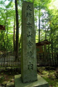 若狭へ向かう九十九折の周山街道(国道162号線)に清滝川が沿って流れる。川に面して、楞迦山(りょうが-さん)が迫る。山の斜面に伽藍が点在する高山寺(こうざん-じ)が建つ。 典籍15000点、経蔵本「高山寺本」などを蔵し、中世以来の学問寺として知られている。「三尾(さんび)の名刹」(ほかに高雄(尾)山神護寺、槙尾山西明寺)の一つに数えられた。 山号を栂尾山(とがのお-さん)という。かつて真義真言宗、現在は単立寺院。本尊は釈迦如来。 境内は、史跡名勝天然記念物国の史跡に指定されている。1994年に「古都京都の文化財」として、世界遺産条約に基づく世界文化遺産に登録された。 ◆歴史年表 奈良時代、774年、第49代・光仁(こうにん)天皇の勅願により、慶俊らが開創した。当初は、「神願寺都賀尾(じんがんじとがのお)坊」と称し、華厳宗だった。 平安時代初期、「度賀尾寺」と記されている。(『尊意贈僧正伝』) 802年、和気弘世(清麻呂長男)の主催により、最澄は神護寺で5カ月にわたる天台の教え「天台三部」を説いた。 814年、天台宗の「都賀尾十無尽院(じゅうむじんいん)」と改称されている。 859年-876年、賢一が都賀尾で般若心経に修練する。 876年、法性坊尊意僧正(後の13代天台座主)が賢一に就き、3年にわたり修行している。 平安時代後期、天台の古刹、度賀尾寺が文覚(もんがく)により復興され、神護寺別院になった。 鎌倉時代、1206年、旧11月、後鳥羽上皇(第82代)の帰依を得てその院宣により、明恵(みょうえ)が神護寺の一院・栂尾十無尽院を贈られた。華厳宗隆盛の根本道場として再興した。(『高山寺縁起』)。後鳥羽上皇の勅語「日出先照高山之寺(日出でて先ず照らす高山の寺)」により、寺名も「高山寺」に改められた。上皇はその勅額を贈ったともいう。近衛家、鷹司、西園寺家などの公家の帰依も受け、堂宇も復興された。明恵は実質的な開山、中興開山になる。 1210年、明恵は『金師章光顕抄』などを著し、栂尾に隠居修行する。 1215年、明恵は四座の講式を定める。涅槃会を始めた。 1216年、石水院(五所堂)が建立される。 1218年、明恵は快慶作の本尊・釈迦如来とともに賀茂の別所に移る。神主・能久は僧房、経蔵を寄進建立する。草庵は「石水院」と名付けられた。その後、明恵は栂尾に戻る。 1219年、金堂、鐘楼などが建立になる。金堂に本尊が安置された。 1221年、北条泰時の軍勢が寺に乱入した。明恵を連行しようとしたものの、明恵の説諭により軍を引いた。明恵は賀茂へ移り泰時と法談する。 1223年、明恵は善妙尼寺を建立し、栂尾に戻る。 1224年、明恵は楞伽山の峰に蟄居し、坐禅修行した。石水院を賀茂の別所より移築した。 1225年、羅漢堂が建立になる。東経蔵を石水院に移した。旧8月、白光(びゃつこう)神、藤原氏の氏神の鎮守社・春日明神、善妙神が鎮守社として勧請された。インド、日本、震旦(しんたん、古代中国)の守護神だった。説戒会が始められ、参詣者が群集する。(『高山寺縁起』『明月記』) 1227年、三重塔が棟上になる。 1228年、石水院が洪水により流出した。石水院は、禅堂院に移される。 1229年、阿弥陀堂、西経蔵が建立される。鎮守社を宝殿の西山傍らに移す。三加禅の庵室が結ばれた。 1230年、明恵と神護寺寺僧の訴えにより、境内地を定める太政官牒(だいじょうかんちょう)が下る。境界の標識「四至牓示(ぼうじ、境界目印)」を打つというものだった。寺域は、東限・源中河、南限・滝尾堺、西限・槇尾谷押河谷北、北限・机谷になる。三加禅を禅堂院の一廓に移し、禅河院とした。絵図が作成され、大門、金堂、三重塔、阿弥陀堂、経蔵などが描かれている。(「太政官牒」・「高山寺文書」『山城国神護寺領高尾山絵図』『高山寺絵図』) 1232年、明恵は「高山寺置文」を定める。その後、旧正月19日、明恵は禅堂院で亡くなり、御廟の地に葬られる。 1233年、喜海は明恵が修行した遺跡に木標を立てた。 1235年、石水院に、春日明神、住吉明神が遷座される。 1236年、明恵の遺徳を偲び、覚厳は十三重塔を建立する。 1238年、住吉神が勧請された。鎮守社4宇を祀り石水院が拝殿になる。(『高山寺縁起』) 1240年頃、春日社が開帳奉幣される。 1244年、明恵上人一三回忌供養が導師・喜海により執り行われた。 1253年、高信は後嵯峨院(第88代)の院宣により『高山寺縁起』を著わした。 1282年、八幡社が遷宮になる。 1320年、花園上皇(第95代)、後伏見上皇(第93代)は春日、住吉のご神体を拝する。 1322年、明雲尼は明恵の木標の遺跡顕彰を石標に変える。 室町時代、1467年-1475年、応仁・文明の乱(1467-1477)により、山名軍が当寺を占拠する。 天文年間(1532-1555)、薬師寺備後守夫人清範が十無尽院を霊雲院に移す。 1547年、細川晴元の兵火により、金堂、十三重塔など大半の伽藍を焼失した。 江戸時代、1634年、寛永年間(1634-1636)とも、永弁、秀融により再興される。仁和寺古御堂などより建物が移築され、金堂が再興された。覚深法親王は高山寺置文十八条を定める。金堂に南都・