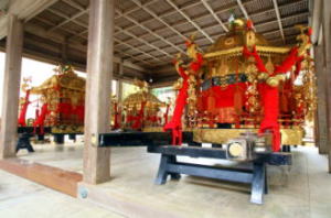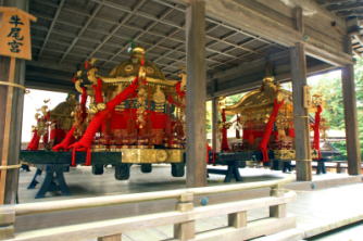 ![]() 樹下神社拝殿に置かれた牛尾宮神輿(左)と三宮神輿 |