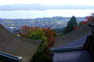 ![]() 山頂からの琵琶湖の眺望、近江富士といわれる三上山が正面の樹間に見える。 |
