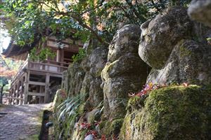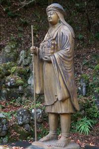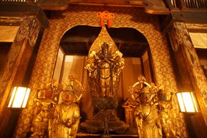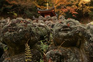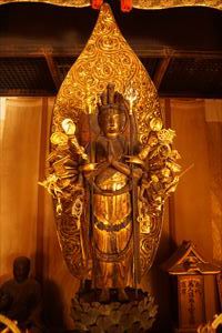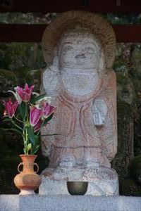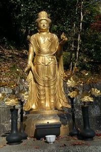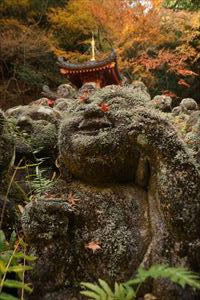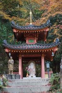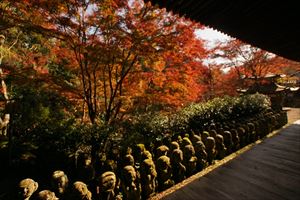 愛宕山(924m、あたごやま)の南東、愛宕参道脇に愛宕念仏寺(おたぎ-ねんぶつ-じ)はある。号は等覚山愛宕院(とうかくざん-おたぎいん)という。旧地が愛宕郷にあり、愛宕寺、愛宕念仏寺と称されていた。 天台宗、本尊は本堂に十一面千手観世音菩薩(厄除け千手観音)、火伏地蔵を安置している。 虚空蔵菩薩は福徳・財宝を授け、一三まいり、合格祈願の信仰がある。鬼子母神は子宝授かりの信仰がある。飛雲観音は航空安全の信仰がある。 洛陽三十三所観音霊場の第16番札所。 ◆歴史年表 奈良時代、第48代・稱徳(しょうとく)天皇(764-770)により開基された。かつて、旧愛宕(おたぎ)郡愛宕郷(東山区松原通大和大路東入北側弓矢町、六道珍皇寺付近とも)にあった。愛宕寺(おたぎでら)と称され、真言宗の教王護国寺(東寺)に属した。珍皇寺の旧名・愛宕寺を継いだともいう。七堂伽藍のある大寺だったという。 また、第60代・醍醐天皇の勅願により、空海(774-835)が創建したともいう。(寺伝) 平安時代初期、鴨川近くにあり、鴨川の洪水で堂宇が流失した。また、兵火により堂宇が焼失する。 延喜年間(901-923)/911年、比叡山の僧・阿闍梨・千観内供(せんかん-ないぐ)により中興される。等覚山愛宕院と号する天台宗延暦寺の末寺になる。千観は生涯仏名を唱え、念仏上人とも呼ばる。寺名もそれに因み愛宕念仏寺と称される。千観を開基としたともいう。(『日本往生記』)。当時は、七堂伽藍を有する大寺院だった。 中世(鎌倉時代-室町時代)以降、衰微した。 江戸時代、本堂、矢ノ根門、仁王門などが建てられていた。本堂に本尊の千手観音(六波羅観音)、火伏地蔵を安置していた。 1711年、「愛宕寺(おたぎでら)」と記されている。(『山城名勝志』) 近代、1922年、松原警察署の設置に伴う区画整理により、堂宇の保存と愛宕山の信仰により、3年の歳月をかけて旧地(東山区)より現在地(右京区)に移転する。 現代、1950年、台風の土砂崩れにより被災する。一時は廃寺になり、「京都一の荒れ寺」と呼ばれる。 1955年、住職に就いた仏像彫刻家・西村公朝により再興された。講堂には、公朝の天井画、壁画、十大弟子像公朝が残されている。 1981年以後、千二百羅漢が10年の歳月をかけて完成する。 ◆千観 内供 平安時代中期の天台宗僧・千観 内供(せんかん-ないぐ、918-984)。男性。俗姓は橘、千観。父・相模守敏貞(橘公頼の子)。12歳頃、比叡山に上がり、運昭に付く。園城寺に入り出家、受戒した。行誉(運昭とも)に師事し、天台教学を学ぶ。禁裏の内供奉十禅師を務め、空也の影響を受け浄土教になり宮中を去る。阿弥陀和讃を作る。962年、摂津国箕面山に隠遁する。963年、勅命により祈雨を祈願したという。第62代・村上天皇は、天台宗10師・法相宗10師を清涼殿宮中に招き法華講を開く。南都・北嶺の高僧による応和宗論(おうわ-の-しゅうろん)論者として選ばれ、辞退した。摂津国・金龍寺(安満寺)を再興し住した。970年、行誉から三部大法を伝授される。著『十願発心記』『八箇条起請』など。66歳。 内供とは、皇居に参内をゆるされた僧位をいう。阿弥陀和讃を作り浄土教を広めた。民衆からは念仏上人と尊称された。 念仏証人と呼ばれ、これに因んで当寺が念仏寺と呼ばれるようになったともいう。 ◆西村 公朝 近現代の仏師・僧・西村 公朝(にしむら-こうちょう、1915-2003)。男性。大阪府高槻市の生まれ。1935年、東京美術学校(現・東京芸術大学)彫刻科に入学し、1940年、卒業した。1941年、美術院国宝修理所に入る。1942年、中国に出征し各地を転戦した。1945年、復員後、、三十三間堂の十一面千手観音千体像(600体)、広隆寺の弥勒菩薩像など数多くの国宝・重要文化財を含む1300体の仏像修復に携わる。比叡山戒壇院の本尊・釈迦如来像の復興、群馬県・浄法寺の伝教大師像などを制作した。1953年、青運院で得度し、1955年より、京都・天台宗愛宕念仏寺住職になる。1959年-1975年、美術院国宝修理所所長になった。1967年-1983年、東京芸大保存修復技術研究主任教授に任じられる。1975年、紫綬褒章を受章する。1982年、仏教伝道文化賞(第17回)を受章し、天台大仏師法印の称号を受けた。1987年、勲三等瑞宝章、1989年、東方文化賞を受章した。1992年、吹田市立博物館館長になる。2000年、円空大賞、2002年、大阪文化賞を受章した。著『仏像の再発見』『仏の世界観』など。88歳。 ◆仏像・地蔵 ◈本堂に、鎌倉時代の「十一面千手観世音菩薩(厄除け千手観音)」を安置する。 ◈地蔵堂には、「火除(火伏)地蔵菩薩坐像」が安置されている。平安時代初期の作になる。「火之要慎(ひのようじん)」のお札で知られる。火伏の神として信仰されている愛宕山の本地仏が、地蔵菩薩であることに由来するという。右手は膝上に置き、左手に宝珠を載せる。蓮華座に結跏趺坐する。 ◈地蔵尊の右に平安時代前期、弘仁年間(810-824)の「吉祥天女像」、左右の脇檀に「二十八部衆像」などが安置されている。 ◈左の厨子内に納められていた「木造千観内供坐像」(重