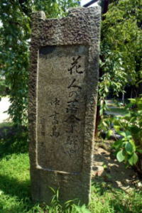 ◆歌碑  「花人の落合ふ駅や中書島」の歌碑が立つ。 近現代の俳人・小説家・高浜虚子(1874-1959)による。