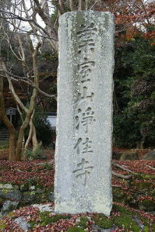 洛西の浄住寺(じょうじゅう-じ)は紅葉の寺として知られている。葉室寺とも呼ばれた。山号は葉室山(はむろさん)という。 黄檗(おうばく)宗。本尊は釈迦牟尼仏坐像。 京都洛西観音霊場(洛西三十三所観音霊場)第30番札所。御朱印が授与される。御朱印帳一種もある。 ◆歴史年表 創建の詳細は不明。 平安時代、弘仁年間(810-824)/801年、第52代・嵯峨天皇の勅願により、第3代天台座主・円仁(794-864)が開創したともいう。常住寺と称した。勅願寺になる。旧跡は嵯峨天皇仏舎利安置所とされた。(縁起)。また、野寺常住寺(のでら-じょうじゅうじ)に関連するともいう。 その後、荒廃する。葉室家の別業になる。 鎌倉時代、弘長年間(1261-1263)/1260年/1261年、中納言・葉室定嗣(定然、1208-1272)が出家し、山荘を寺とし浄住寺に改めた。奈良・西大寺の真言律宗の僧・叡尊思円(えいそん-しえん、1201-1290)を請じて中興した。(『感身覚世記』)。当初は戒律弘教の道場だった。 1272年、定嗣没後、公家・葉室家の菩提寺になり盛え、多くの堂宇が建ち並んでいたという。 1298年、将軍家祈願所になる。塔頭49院があった。 南北朝時代、本堂、鐘楼、鼓楼、舎利殿、多宝塔、食堂などが建ち並んでいた。 1333年、千種忠顕は峰ヶ堂一帯に布陣した。六波羅攻めで、当寺は六波羅の北条勢の兵火により焼失し、その後荒廃した。 室町時代、1493年、第10代・足利将軍・義材(義稙)を攻めた細川政元の反攻により、将軍側近の権大納言・葉室教光も処刑になり、教光の別業の浄住寺もそれに伴い破却された。 江戸時代、1689年/1687年/元禄年間(1688-1704)、葉室孝重は、黄檗宗の禅師・鉄牛道機に帰依し、鉄牛を招き、真言律宗より黄檗宗の寺として再興した。当時の本堂、開山堂が現存する。また、稲葉正則、父子の葉室頼孝(よりたか)・頼重、万里小路淳房が、伊達綱村、島津綱貴、池田綱清、稲葉正通ら大名の寄進により再興したともいう。長松(鉄牛)下の一派頭として46末寺末庵があった。また、鉄牛は福島正則の援助により、寺地を購入し、弟子・知幻元成に復興させたともいう。鉄牛は中興開山になる。 1775年、方丈、庫裏を焼失する。その後、再建される。 現代、1978年、廃れていた洛西三十三所観音霊場めぐりが再興された。 2018年、9月、台風21号被害で境内のモミジ数10本が倒木する。 ◆円仁 平安時代前期の天台僧・円仁(えんにん、794-864)。男性。慈覚大師。下野国(栃木県)に生まれた。9歳で大慈寺・広智に師事する。808年、15歳で唐より帰国した比叡山の最澄に師事し、最期まで14年間仕えた。815年、東大寺で具足戒を受ける。比叡山で12年の籠山行に入る。だが、5年後、法隆寺、四天王寺での夏安吾(げあんご、修行僧の集団生活による一定期間の修行)講師、東北への教化を行う。一時心身衰え、829年、横川に隠棲した。常坐三昧、法華経書写などの苦修練行を続け、夢中に霊薬を得て心身回復し、法華経書写を始め、小塔(如法堂)を建て写経を納めたという。首楞厳院(しゅりょうごんいん)を建立した。836年、837年、渡唐に失敗し、838年、最後の遣唐使として渡る。その後、遣唐使一行から離れ、840年、五台山・大花厳寺を巡礼し、国清寺で学ぼうとしたが許可が下りなかった。長安・大興善寺で金剛界の灌頂を受け、青竜寺で胎蔵界灌頂、蘇悉地大法を授かる。また、悉曇(梵語)、止観(禅)も学んだ。山東半島、赤山新羅坊の新羅寺・赤山法華院で新羅仏教を学ぶ。現地では仏教弾圧(会昌の破仏)があり、日本と新羅はこの間に国交断絶していた。847年、帰国し、仏典、金剛界曼荼羅など多数を持ち帰る。848年、比叡山に戻り、円珍に密教を教えた。横川中堂(根本観音堂)を建立する。854年、第3世・天台座主に就く。862年、東塔に天台密教の根本道場・総持院を建立した。『顕揚大戒論』、9年6カ月の唐滞在記である『入唐求法巡礼行記』(全4巻)を著す。東京・瀧泉寺、山形・立石寺、松島・瑞巌寺など多くの寺を開いた。没後、日本初の大師号(慈覚大師)を贈られた。入唐八家(最澄・空海など)の一人。70歳。 ◆叡尊 鎌倉時代前期-後期の律宗の僧・叡尊(えいそん/えいぞん、1201-1290)。男性。睿尊、字は思円、諡号は興正菩薩。大和国(奈良県)生まれ。父・興福寺の学侶・慶玄、母・藤原氏。幼くして母を亡くし、醍醐寺に入り真言を学ぶ。1217年、叡賢を師として出家した。1234年、戒律の復興を志す。1235年、円晴(えんせい)が東大寺で『四分律行事鈔』講じたのを聞く。1236年、東大寺で円晴、覚盛(かくじょう)、有厳らと自誓受戒し比丘になる。その後、大和海竜王寺に移る。1238年、西大寺に住み、再興した。1262年、鎌倉幕府の北条時頼・実時に招かれて鎌倉に下り、北条一族、御家人などに授戒した。1269年、般若寺で「非人供養」する。1281年、蒙古来襲時に、伊勢神宮、石清水八幡宮で異国降伏の祈祷も行う。著『梵網古迹文集』 (10巻) 、自叙伝『感身学正(かんじょうがくしょう)記』 (3巻) など。90歳。 戒律の復興に努め、律宗中興の祖になる。「非人」