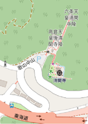 清閑寺(せいかん-じ)は、「歌の中山寺」とも呼ばれる。歌の中山とは、清水寺から清閑寺にいたる小径を意味する。近くに渋谷越(しぶたに-ごえ)も通じている。山号は歌中山という。 境内は、谷間に京都市街地を望む。清水音羽山の中腹に位置し、第79代・六条天皇の清閑寺稜、第80代・高倉天皇の後清閑寺陵のすぐ南にあたる。 新義真言宗智積院の末寺。本尊は千手観音立像。 ◆歴史年表 創建の詳細、変遷は不明。 平安時代、802年、比叡山の紹継(しょうけい)法師が開創したともいう。第50代・桓武天皇(在位:781-806)が創建したともいう。(寺伝、『伊呂波字類抄』『山州名跡子』) かつて、天台宗延暦寺の寺であり、因幡堂平等寺(下京区)が兼帯していた。その後、荒廃した。 第66代・一条天皇の時(在位:986-1011)、伊予守・佐伯公行(さえき -きんゆき/きみゆき)が鎮護国家のために再興したという。法華三昧堂、法堂などが建てられた。(『伊呂波字類抄』) 996年、法華三昧を修する寺として、一条天皇の勅願寺になる。(『伊呂波字類抄』『拾芥抄』) 1000年、勅願寺になる。 平安時代末、1129年、初めての火災により焼失した。(『百錬抄』)。その後、再建されている。 小督局(こごうの-つぼね、1157-1205以降?)が当寺で出家したという。 1176年、第79代・六条天皇が寺内の小堂に葬られる。 1181年、第80代・高倉天皇没後、遺骸はその日のうちに清閑寺に移され葬られた。法華三昧堂が建てられ、堂下に埋葬される。(『高倉院昇霞記』)。以後、皇室ゆかりの寺になる。 鎌倉時代、山門(比叡山延暦寺)に属した。法華堂、宝塔などが存在した。 1213年、清水寺の法師が領内に無断で堂宇を建てたことから、比叡山延暦寺と清水寺の本寺・奈良興福寺の間で抗争が起きた。 室町時代、真言宗に属した子院があった。 応仁・文明の乱(1467-1477)で焼亡している。その後、荒廃した。 安土・桃山時代-江戸時代、慶長年間(1596-1614)、紀州・根来(ねごろ)寺の僧・性盛(しょうせい)が復興し、新義真言宗に改宗した。 江戸時代、平等寺供僧(ぐそう)西之坊の兼帯寺になる。 1858年、境内にかつてあった茶室「郭公亭(かっこうてい)」で、清水寺成就院住持で尊皇攘夷派の月照(げっしょう)と政治家・軍人・西郷隆盛が密会した。 1863年、高倉天皇陵、六条天皇陵の修復が行われる。 近代、1873年、8月、市中共同墓地が設置される。(『京都坊目誌』) 現代、1991年、茶室「郭公亭(かっこうてい)」が解体される。 ◆紹継 平安時代の僧・紹継(しょうけい、 ?-?)。詳細不明。802年、清閑寺を開創したともいう。 ◆佐伯 公行 平安時代中期ー後期の公卿・佐伯 公行(さえき-の-きんゆき/きみゆき、?-?)。男性。姓は宿禰。972年、見蔵人所出納、974年、権少外記、少外記、元蔵人所出納、976年、大外記になる。977年、外従五位下、愁訴により従五位下、能登権介を兼ねた。987年、遠江守、従四位下、信濃守になる。東山・清閑寺を再興し、996年、第66代・一条天皇により御願寺(勅願寺)に列せられた。藤原為光の娘・寝殿の上から一条院を購入し、東三条院(藤原詮子)に献上した。東三条院の口添えにより、998年、前信濃守、播磨介になった。1010年、出家した。 前伊予守正四位下。 ◆六条 天皇 平安時代後期の第79代・六条 天皇(ろくじょう-てんのう、1164-1176)。男性。順仁(のぶひと)。父・第78代・二条天皇、母・大蔵大輔伊岐致遠(いきの むねとお)の娘の第2皇子。祖父・後白河上皇(第77代)と父・二条天皇の政争があった。1165年、二条天皇が重病になり、急遽、親王宣下を受け、当日夜に2歳で即位した。後白河上皇が院政を敷き、平清盛が太政大臣になる。後白河上皇は、清盛没後の六条天皇派の策動を恐れ、1168年、5歳で自らの皇子(六条天皇の伯父)・憲仁(のりひと)親王(第80代・高倉天皇)を即位させた。六条天皇は太上(だいじょう)天皇になる。元服以前に称した初例になった。六条天皇は、わずか3年の在位だった。以後、六条上皇は、後白河上皇に養育されている。1176年、藤原邦綱の東山邸(若松亭)で病死する。13歳。 父・二条天皇(親政派)、祖父・後白河上皇(院政派)の対立の中で、病弱だった六条天皇は歴代天皇の中で最も若く即位し、最も若く退位した。 陵墓は清閑寺陵(東山区)になる。1863年に陵は修復された。 ◆高倉 天皇 平安時代後期の第80代・高倉 天皇(たかくら-てんのう、1161-1181)。男性。憲仁(のりひと)。父・第77代・後白河天皇、母・平時信(ときのぶ)の娘・尊称皇太后・建春門院滋子(しげこ)の第7皇子。滋子の姉は平清盛の妻・時子。3歳で清盛の娘で関白基実の妻・盛子の猶子になる。1166年、第79代・六条天皇の皇太子になる。1168年、六条天皇の譲位を受けて8歳で即位した。1172年、最盛期の清盛の娘・徳子(建礼門院)を中宮にする。院政を敷く父・後白河法皇と清盛の対立が起こる。1177年、鹿ヶ谷事件が起こる。1178年、徳子が産んだ生後間もない皇子・言仁(ときひと)親王(第81代・安徳天皇)を皇太子にした。1179年、清盛は後白河法皇の院政を止め、法皇を鳥