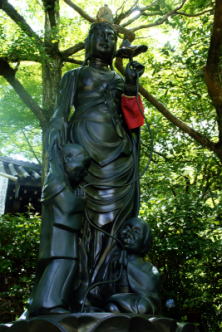 東山三十六峰の今熊野山麓に今熊野観音寺(いまくまの-かんのん-じ)はある。今熊野の地は古くより貴人の葬所であり、平安時代には観音霊場として、また藤の名所にもなった。熊野権現出現の伝説地としても知られた。 後白河法皇(第77代)ゆかりの頭痛封じの伝承により、「頭の観音さん」と親しまれている。「今(新)熊野」「今(新)熊野観音」ともいう。正式には「観音寺」という。山号は後白河法皇より贈られた「新那智山」という。 泉涌寺の塔頭の一つで真言宗泉涌寺派、本尊は十一面観世音菩薩。 西国三十三所観音霊場の第15番札所、泉山(せんざん)七福神の第3番、恵比寿神は、商売繁盛、海運守護の信仰がある。ぼけ封じ・近畿十楽観音巡礼の第1番札所、京都七福神のえびす神、洛陽三十三所観音霊場の第19番札所、神仏霊場会第122番、京都第42番。弥勒菩薩(六七日)は京都十三仏霊場めぐりの第6番札所。京の通称寺霊場31番。 頭痛封じ・平癒、ぼけ防止、身体健康・健康長寿・病気平癒・無病息災、開運厄除・災難消除、家内安全、良縁成就、安産祈願、諸芸上達、心願成就、智慧授け・学業成就・受験合格、商売繁盛・社業繁栄、子護大師は子ども守護などの信仰がある。御朱印(6種類)が授けられる。 ◆歴史年表 創建の詳細は不明。 平安時代、807年/大同年間(806-810)/天長年間(824-834)、空海が熊野権現の霊示により、この地に庵を結んだことに始まるという。 812年/825年頃/弘仁年間(810-824)、空海は第52代・嵯峨天皇の寄進、勅により諸堂を造営したという。 天長年間(824-834)、伽藍は完成をみたという。 左大臣・藤原緒嗣(774-843)により、その邸に伽藍造営が図られたともいう。 855年、藤原緒嗣の子・春津に受け継がれ完成した。 969年、 左大臣・藤原師尹(もろまさ)を同寺西岡に葬る。 1016年、一条尼上(藤原道長室倫子の母・穆子 [ぼくし] )を無常所に葬る。 1135年、当寺が「二十五番札所」として記されている。(行尊『巡礼手中記』) 1150年、当寺が「十八番札所」として記されている。(長谷僧正『巡拝記』) 1160年、後白河上皇(第77代)がこの地の法住殿に熊野権現を勧請した。当山の本尊を本地仏と定め、「新那智山」の山号を贈り、今熊野観音と称した。 1161年、当寺が「二十六番札所」として記されている。(覚忠『巡礼記』) 平安時代-鎌倉時代、この地で、葬送、追善が行われる。 鎌倉時代、1234年、後堀河上皇(第86代)没後、当寺北の観音寺陵が築かれ埋葬された。観音堂は北面し、末永く本尊を拝するように葬られている。 1244年、第87代・四条天皇の二周忌に法華八講が修された。 鎌倉時代-南北朝時代、永暦年間(1331-1334)、山麓に新熊野神社が建てられた。今熊野は、紀州熊野の観音霊場になぞらえられた。その本地仏安置の寺とされ、社殿が山麓に造営された。神社と寺を結ぶ観音寺大路(現在の泉涌寺道)が通され、熊野御幸のための御潔斎場の御精進屋が観音堂近くに建立される。 室町時代、1468年、兵火により泉涌寺とともに焼失した。 1470年、応仁・文明の乱(1467-1477)により焼失する。北朝、足利将軍の援助により復興された。乱後、泉涌寺塔頭になったという。 1515年頃-1517年、今熊野観音寺別当・雲龍院と今村兄弟との間で、今熊野観音寺巡礼堂領をめぐる相論があった。 安土・桃山時代、1580年頃、現在の地に堂宇が建立されたとみられている。 江戸時代、西国霊場巡拝が盛んになる。 1712年/承徳年間(1711-1716)、宗絮祖元律師により、現在の本堂が建立された。 現代、2005年、「平成洛陽三十三所観音」が復興された。 ◆空海 奈良時代-平安時代前期の真言宗の開祖・空海(くうかい、774-835)。男性。弘法大師。讃岐国(香川県)の生まれ。父・豪族の佐伯田公(義通)、母・阿刀氏。788年、15歳で上京し、母方の叔父・阿刀大足に師事し儒学を学ぶ。791年、18歳で大学明経科に入るが、中途で退学し私渡僧(しどそう)として山岳修行を始め四国の大滝岳や室戸崎などで山林修行した。797年、『聾瞽指帰(ろうこしいき)』を著す。798年、槙尾山寺で沙弥になり、教海と称する。804年、東大寺戒壇院で具足戒を受ける。遣唐使留学僧として唐へ渡り、805年、長安・青竜寺の恵果(けいか)により両界、伝法阿闍梨の灌頂を受ける。806年、当初の20年の義務期間を2年に短縮して帰国、多くの経典、密教法具などを持ち帰る。入京できず太宰府・観音寺に住した。809年、入京を許される。810年、高雄山寺(神護寺)を経て、811年、乙訓寺に移り、約1年間任に当たった。別当になる。812年、乙訓寺を訪れた天台宗開祖・最澄は、空海と会っている。その後、空海は高雄山で最澄らに金剛界結界灌頂を行った。後、二人は決裂し、断絶する。813年、東大寺別当、819年頃/818年、高野山を開く。822年、東大寺に灌頂道場(真言院)を開く。823年、東寺を真言密教の道場にした。824年、高雄山寺を神護寺に改名する。神泉苑で祈雨の修法を行う。827年、大僧都になる。828年、綜芸種智院を創立した。832年、高野山で万灯会、834年、正月、宮中中務省で後