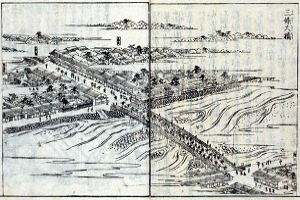 鴨川に架かる三条大橋(さんじょう-おおはし)は、平安京以来、東西交通の役割を担っていた。東海道五十三次の西の起点になっており、付近は三条口、三条大橋口、大津口、粟田口とも呼ばれた。 「京都の三大橋」(ほかに四条大橋、五条大橋)の一つ。「日本百名橋」の一つに選出されている。 ◆歴史年表 室町時代前期、すでに簡素な板橋が架けられていた。(「町田家旧蔵本」) 1423年、三条河原に橋が架けられる。幕府は、公方の延臣に橋料を課した。(『兼宣公記』) 1525年-1536年、簡素な板橋が描かれている。(「洛中洛外図屏風」町田本) 安土・桃山時代、1589年、豊臣秀吉は三条橋の架橋を命じる。 1590年、本格的な構造を持つ日本最初の石柱橋が架けられた。豊臣秀吉の命により奉行・増田(ました)長盛による大工事になる。長さ61間(110m)、幅4間5寸(7.2m)あった。(『京の三名橋 上 三条大橋』)。旧3月、秀吉は北条氏政・氏直父子討伐の、小田原戦役の軍馬を通すために橋から出陣する。 1594年、旧8月、石川五右衛門が釜ゆでされる。 1600年、石田三成、小西行長、安国寺恵瓊は、関ヶ原の戦いで西軍首脳として六条河原で斬首され、三条橋の橋詰に首が晒された。 江戸時代、1615年、長宗我部盛親は、六条河原で6人の子女とともに斬首され、三条橋に晒された。 1623年、旧1月、大水により三条へ水が越した。(『舜旧記』) 1627年、橋が新造された。(『京の三名橋 下 五条大橋』) 1629年、旧5月、洪水により三条大橋に罷出(まかりで)る。(『舜旧記』) 1635年、橋が修復される。(『京の三名橋 下 五条大橋』) 1643年、朝鮮使節入洛のため、三条大橋・三条小橋の修復が行なわれる。 1651年、架け直される。(『京の三名橋 下 五条大橋』) 1654年、三条大橋が鴨川に架かる11橋の一つとして記されている。(「新板平安城東西南北町並洛外之図」) 1662年、旧5月、寛文近江・若狭大地震(寛文京都地震)により被災する。(『殿中日記』) 1667年、旧8月、長さ64間4尺(116m)、幅3間5尺5寸(5.4m)あった。(「京三条大橋指図」) 1669年、三条大橋は架け替えられる。架け直される。(『京の三名橋 下 五条大橋』)。奉行は、木村惣右衛門、今井七郎兵衛が任じられる。(『町触集成別巻2』)。京都所司代・板倉重矩による寛文新堤の築造により、三条-五条間には新しく石垣の堤防が築かれ、川幅は狭まる。七条新地、宮川町が生まれ、芝居小屋などが移動された。 1674年、旧4月11日、畿内大洪水により、三条大橋・五条大橋は流失した。(『京の三名橋 下 五条大橋』「水害報告書」)。三条大橋は修復される。 1676年、旧5月6日、大雨洪水により、三条大橋・五条大橋は流出した。(『京の三名橋 下 五条大橋』「水害報告書」) 1679年、旧8月、長さ57間2尺(103m)、幅3間5尺5寸(5.4m)あった。(「中井家文書」) 1680年、橋下の敷石が修復される。(『京の三名橋 下 五条大橋』) 1681年、橋が修復された。(『京の三名橋 下 五条大橋』) 1682年、キリシタン禁札礼の高札が掲げられる。朝鮮使節入洛のため、三条大橋、三条小橋の修復が行なわれた。 1685年、三条大橋・五条大橋が記されている。(『京羽二重』) 1686年、修復される。(『京の三名橋 下 五条大橋』) 1689年、修復された。(『京の三名橋 下 五条大橋』)。長さ61間(110m)、幅3間(5.4m)あった。(『京大絵図』『京の三名橋 上 三条大橋』) 1692年、8月、三条大橋が新造される。奉行は長谷川安定、設楽正秀による。橋長57間4尺5寸(104.9m)、幅3間5尺5寸(6.5m)だった。(『京の水』「京都役所方覚書」『京の三名橋 上 三条大橋』) 1699年、長さ61間(110m)、幅3間(6.4m)あった。(「京大絵図」『京の三名橋 下 五条大橋』) 1708年-1711年、長さ57間4尺5寸(103m)、幅3間4尺(5.4m)、敷石2030坪(6710㎡)あった。(「賀茂川筋明細絵図(川方勤書」) 1711年、朝鮮使節入洛のため、三条大橋、三条小橋、五条大橋の大規模修復が行なわれる。奉行は平岡良久、角倉与一による。三条大橋について使節随員・申維翰が記している。(『海遊録』『京の三名橋 下 五条大橋』)。鴨川に2000坪(6611㎡)の敷石が置かれ、63本の石柱の橋脚が建てられた。長さ101m(102m/105m)、幅7m(5.5m/6.7m/8.5m)あった。長さ57間4尺5寸(105m)、幅3間5尺5寸(7.1m)あったともいう。(「京都御役所向大概覚書」)。長さ61間(110m)ともいう。(『山城名跡志』『京の三名橋 上 三条大橋』)。橋の高さ2.4m、幅は現在の半分、長さが現在よりも長かったのは、当時の鴨川の川幅が現在よりも広かったことによる。橋は、鴨川の氾濫で度々流出した。幕府が管理する公儀橋のためにすぐに修復された。秀吉以後、16回の架け替えが行われたともいう。 1719年、朝鮮使節入洛のため三条大橋・三条小橋が補修された。(「上方所々橋新造御修復共年数之覚」『京の三名橋 下 五条大橋』) 1720年、千代原村・柏屋庄左衛門は、唐物沖買、抜買の咎により、三条橋東詰に3日間晒され、粟田口で鼻削ぎ、追放になる。晒し初例ともいう。 1728年、旧6月7日、大雨洪水により、祇園祭の神輿は三条橋を過ぎ川原町より四条に出た。(『京の三名橋 下 五条大