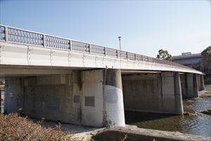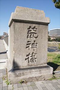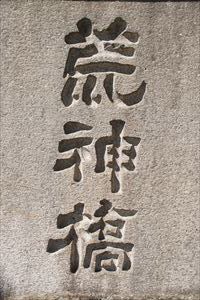 荒神橋(こうじん-ばし)付近は、「京の七口」の一つ、「荒神口」「今道の下口」に当たる。平安時代以前より、白川街道、近江山中、坂本につながる山中越の起点になっていた。 荒神の名の由来は、付近にある京都七福神の一つ、清荒神(きよしこうじん)護浄院に由来する。火の守護神であり、「荒神さん」とも呼ばれている。 一帯は、「荒神河原」、通り名から「近衛河原」、藤原道長建立の法成寺に因み「法成寺河原」とも呼ばれた。 ◆歴史年表 江戸時代、簡単な仮橋が架けられていた。「銭取橋(ぜにとりばし)」と呼ばれた。個人が所有し、利用者から通行料を取ったことに因んでいる。 1854年、第121代・孝明天皇は、御所の火災により下鴨神社に避難した。また、桂宮御殿に移る際に架けられたともいう。このため「御幸橋」と呼ばれたという。 1858年、日米修交通称条約締結に伴い、朝廷は伊勢神宮に奉幣使を遣わすことになった。だが、仮橋が洪水により流出する。荒神口手伝い働き・三文字屋与兵衛らに申し渡し、奉行所も加わり徹夜で仮橋を渡した。翌日、勅使・徳大寺公純は、御所清和門を出て無事に橋を渡り、吉田社を経て伊勢に向かった。(『京都雑色記録』) 1865年、本願寺寄進により橋が新造の運びになる。 1867年、竣工し、行幸を想定し「御幸(みゆき)橋」と名付けられる。資金は募集により、広如門主も金1000両を寄進した。(『本願寺史』第3巻) 1868年、橋の渡り初めが行なわれる。以前は「吉田口新橋」とも呼ばれていた。以後、「勤皇橋」「御幸橋」とも呼ばれる。 近代、1870年より、京都府は橋の修繕費として、地車1両につき50文の通行料を徴収した。 1872年、橋の東詰に京都府は牧畜場(牛、羊)を設けた。 1914年、現在の橋が架けられる。 1935年、「昭和10年鴨川大洪水」により橋は流失する。 現代、1953年、荒神橋事件が起きた。 1981年、橋の北側に歩道の拡張工事が行なわれている。 ◆荒神橋 現在の荒神橋の架設年は1914年になる。鴨川に架かる橋としては七条大橋に次いで古い。 橋種は8径間単純PCT桁(PC橋)、橋長110.3m/110m、幅員10.7m/旧7.1m、路線名は春日緯6号線。 ◆法成寺 付近の河原は、「荒神河原」、「近衛河原」と呼ばれた。平安京の近衛大路に由来し、現在も「近衛通」という通り名が残されている。この辺りでは、印地という石合戦が行なわれた。 かつて、鴨川東岸に法成寺という大寺院があり、「法成寺河原」とも呼ばれた。法成寺は、藤原道長が奈良・東大寺に擬して、平安時代後期、1020年に建立している。阿弥陀堂は、中川御堂とも呼ばれる。度々の火災、戦乱、平安時代後期、1185年の大地震により消滅した。 ◆山当て 荒神橋付近からは、北山、東山、五山送り火の大文字山が見晴せる。 橋の東にある大文字山は、「山当て」といわれる景観手法を用いている。視線の先に山が当たり、通りの方向を定めた。古来からの都市計画の一つとされる。 ◆車道 鴨川に架かる仮橋は、当初は板を渡した簡単なものだった。そのため江戸時代には、牛車は河原中の「車道(くるまみち、牛道)」を渡河していた。車道には、「車石(くるまいし、輪形石)」が敷かれていた。石にはレール状の2本の溝が刻まれており、牛車の車輪はこの溝に沿って通行していた。これにより、牛車はぬかるむこともなく、重い荷も効率よく運ぶことができた。 車石は、三条街道(大津街道、京津街道)、鳥羽街道(大阪街道)、伏見街道、竹田街道などでも見られた。単線では、午前中は上り、午後は下り通行に分けられていた。車石の石材は、竹田街道、鳥羽街道など摂津芦屋付近の六甲花崗岩、山城笠置付近の柳生花崗岩が使われている。 車道の登場は、江戸時代前期、元禄年間(1688-1704)ともいわれている。溝については、最初から加工されていたとも、自然にできたともいう。現在では後者が有力説になっている。 ◆京の七口 荒神口は「京の七口」の一つに数えられ た。橋の西にある護浄院(清荒神)に由来する。かつては、「志賀道口」、「今道の下口」、「吉田口」とも呼ばれた。橋の東口は、志賀越道(しがごえみち、今道、山中峠)に通じていた。橋からの古道は、東北方向に直線に進み、百万遍を経て東進し白川口に至った。 「京の七口」について、「七口」とは定まらず「十口」ともいう。実際にはそれら以外の複数の間道もあったという。 安土・桃山時代、1591年、豊臣秀吉の御土居築造の際に七口は、「粟田口(東)」、「東寺口(坤)」、「丹波口(西)」、「清蔵口(北)」、「鞍馬口(艮)」、「大原口(北)」、「荒神口(東)」とされた。 江戸時代には、「山陽道(摂津道)東寺口」、「東海道(伊賀伊勢道)五条橋口」、「西海道(九州道)四条大宮口」、「南海道(紀州道)竹田口」、「東山道(近江道)三条 橋口」、「北陸道(若狭道)大原口」、「山陰道(丹波道)清蔵口」の呼称があった。 また「鳥羽口」、「伏見口」、「丹波口」、「粟田口」、「八瀬口」、「若狭口」、「長坂口」、「東寺口」、「竹田口」、「五条橋