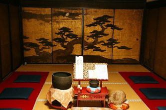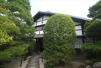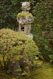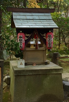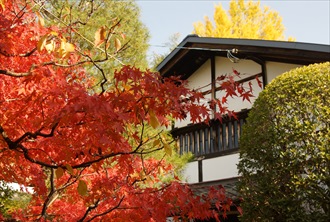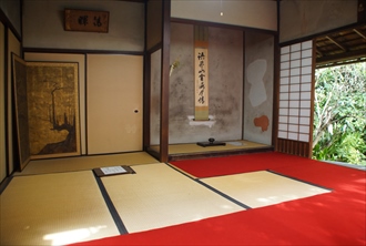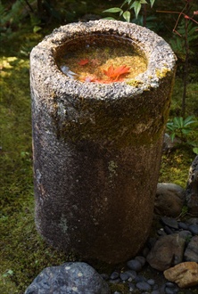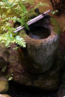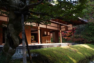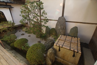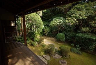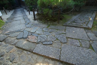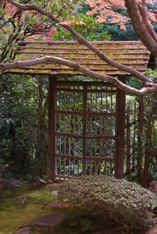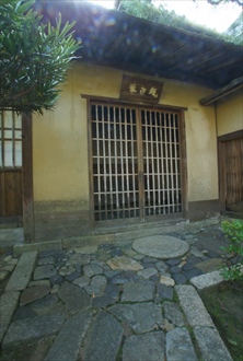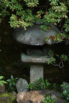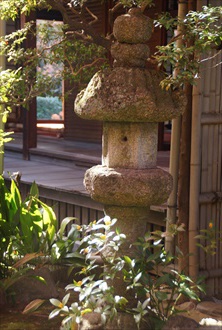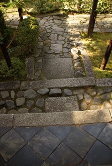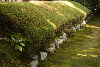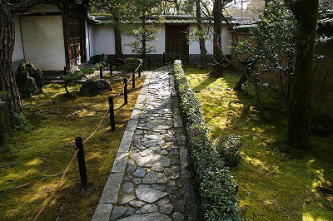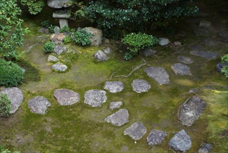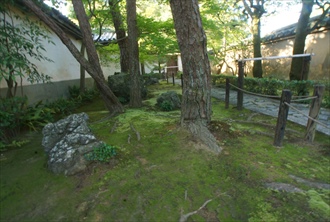 ![]() 「思惟の庭」、窪地に飛び石が配置されている。その先が茶室「既白軒」。 |
