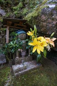 雲ヶ畑の岩屋橋の南に帰命山無量寿寺、福蔵院(ふくぞういん)はある。 浄土宗知恩院派、本尊は阿弥陀如来。 ◆歴史年表 創建の詳細、変遷は不明。 奈良時代、792年、最澄の門弟・空忍(橘軍氏)により堂宇が創建されたことに始まるという。阿弥陀三尊を感得し安置した。天台宗であり、比叡山三千坊の一つに数えられた。 室町時代、1473年、室町幕府第9代将軍・足利義尚の命により浄土宗に改宗する。 安土・桃山時代、天正年間(1573-1592)、石清水八幡宮・豊蔵坊(ほうぞうぼう)より十一面観音像を遷した。豊臣秀吉の守護仏だったという。 江戸時代、明和年間(1764-1772)、第117代・後桜町天皇は紫宸殿の南庭にあった左近の桜の種を移植したという。 1854年、現在の本堂が建立された。 ◆空忍 奈良時代-平安時代前期の天台宗の僧・空忍(くうにん、 ?-?)、橘軍氏。詳細不明。最澄の弟子。792年、この地、雲ヶ畑に堂宇を創建し、阿弥陀三尊を安置した。 ◆仏像 ◈本堂に「阿弥陀如来像」を安置する。 ◈観音堂に、「十一面観音像」が安置されている。石清水八幡宮豊蔵坊の豊臣秀吉の守護仏だったという。安土・桃山時代、天正年間(1573-1592)に遷された。 ◆松上げ 向かいの山で「松上げ」(8月24日)が行われる。この地に隠棲した惟喬親王を慰めるために始められたという。また、五穀豊穣を祈り、愛宕神に神火を供するためという。 里の愛宕山に、櫓(6m四方)を組み松葉で字の形を作る。午後8時頃に、若中の手により松明で松根油に点火される。一字は毎年変わる。点火後、松明を手にした若者が山を下りてくる。かつてはこの後、盆踊りが催されていたという。 ◆桜 境内に、老木「南殿の桜」がある。江戸時代、明和年間(1764-1772)、紫宸殿南庭の桜を第117代・後桜町天皇(1740-1813)より貰い受けたものという。 *参拝要許可 *年号は原則として西暦を、近代以前の月日は旧暦を使用しています。 *参考資料・資料 京都市の駒札、『京都府の歴史散歩 上』、『昭和京都名所図会 3 洛北』、『京都の寺社505を行く』、『京都大事典』、ウェブサイト「コトバンク」 ![]() ![]() ![]() ![]() ![]() ![]() |