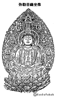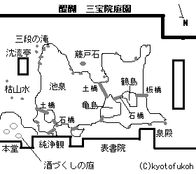 真言宗醍醐派。本尊は弥勒菩薩坐像を安置する。 「ミシュラン・グリーンガイド・ジャポン 1つ星観光地(庭園は2つ星)」(改訂第4版)に選ばれている。アメリカ合衆国の日本庭園専門誌"Sukiya Living Magazine, The Journal of Japanese Gardening"の「しおさいプロジェクト」「日本庭園ランキング(数寄屋生活空間)」に、2015年に第28位に選ばれている。 ◆歴史年表 平安時代、1115年、醍醐寺第14世座主・勝覚(しょうかく)が創建した。(『醍醐寺新要録』)。当初は、五重塔の近く(金堂の西)にあり、本堂、礼堂、寝殿、護摩堂などの諸堂があった。当初は「灌頂院」と呼ばれ、後に醍醐寺の興隆を念じ、三法(仏、仏の教えの法、教えをひろめる僧)に因み「三宝院」に改めた。醍醐五門跡の一つに数えられた。 1131年、定海の時、灌頂院が建立される。結縁灌頂の道場になる。 1143年、鳥羽上皇(第74代)の御願所になる。供僧15人が置かれた。 鎌倉時代末、金剛輪院(こんごうりん-いん)が仁王門北西から現在地に移され復興される。 南北朝時代、1379年、足利義満は武家護持僧の管領役を三宝院に一任する。 室町時代、1395年、満済は18歳で醍醐寺座主、三宝院門跡になる。 1401年、旧1月、足利義満が参籠した。北山第に移る。(『迎陽記』) 1428年、門主・満済が准三后を宣下され、以後、歴代門跡が醍醐寺の座主を独占した。 応仁・文明の乱(1467-1477)で焼失し、以後、途絶する。 安土・桃山時代、醍醐寺座主・義演は金剛輪院(現在の三宝院)を復興した。この頃より、三宝院と呼ばれた。 1598年、旧2月、豊臣秀吉は、花見の下見に金剛輪院を訪れた。再訪した秀吉は自ら庭園の縄張りを行う。旧3月15日、秀吉が企画した壮大な「醍醐の花見」が催される。金剛輪院が増改築された。旧4月、作庭が始まり、聚楽第より藤戸石が運び込まれる。旧5月、作庭が終わる。旧8月、秀吉が亡くなった。旧9月、北万所の援助により工事が再開される。旧12月、秀頼、北政所により寝殿、書院が建てられた。 1599年より、義演により庭園の整備が始まる。 1600年、旧1月、東山・阿弥陀ヶ峰の豊国社より豊国明神社が勧請された。 江戸時代、修験道の根本道場になった。 1606年、義演准后が醍醐寺座主に就く。荒廃していた寺を復興させた。院は座主房になり、後に三宝院の名跡を継ぐ。 1608年-1611年、庭師・賢庭が庭園の改修を行う。 1623年-1624年、義演は庭園の大改修を行う。 1811年、豊国明神社が再建される。 1864年、禁門の変の際に、長州の一向僧・金剛隊6人は当初興正寺に匿われ、三宝院に落ち延びた。その後、7月26日、新撰組に捕縛され、六角獄舎に投獄された。 近代、1871年、江戸幕府の定めた三門跡制(宮門跡、摂家門跡、准門跡)は廃止になり、門跡の称号も廃された。 1885年、旧門跡は復称を許される。 現代、2001年、「土牛の桜」のクローン桜「太閤千代さくら」が開花する。 ◆聖宝 平安時代前期-中期の真言宗の僧・聖宝(しょうぼう、832-909)。男性。俗名は恒蔭王(つねかげ-おう)、諡号は理源大師。 大和国(奈良県)/讃岐(香川県)の生まれ。父・兵部大丞葛声王。第38代・天智天皇皇子の歌人・施貴皇子(しきのみこ)の子孫、春日親王の末裔という。847年、空海の弟子・真雅から密教を学び出家した。東大寺の東僧坊南第2室に住し、願暁・円宗に三論、平仁に法相、玄栄に華厳、真蔵に律を学ぶ。役小角に私淑し、860年頃より、葛城山、大峯山で修験道を修めた。869年、興福寺・維摩会の堅義(りゆうぎ)に三論宗の立場で論を立て名を知られる。師・真雅の勘気を解かれた後、871年、真雅より無量寿法(真言密教修法)を受けた。真雅より離反し、874年、笠取山頂に道場を開き、醍醐寺を創建する。880年、高野山の真然(しんぜん)に学ぶ。884年、東寺・源仁(げんにん)より伝法灌頂を受けた。887年、源仁につき、阿闍梨(あじゃり)になる。890年、藤原良房が聖宝のために建立した深草・貞観寺の座主になった。894年、権法務、895年、東寺二長者、897年、朝廷の命により日蝕の際に祈祷する。飛鳥・川原寺検校、東寺長者・別当、西寺別当を歴任し、905年、三論宗の本所として東大寺東南院を建立し、院主・別当、七大寺検校になった。906年、僧正、東寺長者になる。奈良・弘福寺などに就く。78歳。 真言宗醍醐派小野流の祖師、醍醐寺の開祖になる。吉野・金峯山(きんぶせん)の整備・金剛蔵王像を安置し、中世以降、修験道中興の祖といわれた。第59代・宇多天皇、第60代・醍醐天皇の帰依を受けた。 ◆勝覚 平安時代後期の真言宗の僧・勝覚(しょうかく、1057/1058-1129)。男性。父・左大臣・源俊房、母・藤原朝元の娘。醍醐寺座主師・定賢を継ぎ、1086年、醍醐寺14代座主になる。義範に灌頂を受けたる。清滝宮を上下醍醐寺に勧請し鎮守とした。1115年、醍醐寺山内に三宝院を建立した。桜会(清滝会)を始める。1117年、神泉苑での祈雨の請雨経法を修した。白河上皇(第72代)の出家の際に剃り手を勤め、上皇のために、1127年、高野山に御願の塔を建てた。東寺長者、東大寺別当を歴任