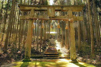 京北の地、桂川近くにある賀茂神社(かもじんじゃ)の社殿は、杉林の中に建てられている。