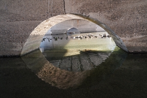 かつて鴨川の東岸は、いまよりも広く、仲源寺の辺りまで、西岸は柳馬場辺りまで河原が広がっていた。普段は何本かの小川の流れがあった。 四条大橋(しじょう-おおはし)は、公儀橋ではなく、庶民の手により架橋された仮橋だった。四条通の東にある祇園社(八坂神社)と、西の元祇園梛(もとぎおんなぎ)神社という二つの社の間にあり、四条通は祇園社の門前町として発展し、祇園会との関わりも深い。 四条大橋は、京都の三大橋(ほかに三条大橋、五条大橋)の一つ。 ◆歴史年表 平安時代、1142年、旧5月5日、祇園社参詣のために、感神院砕門の勧進聖による寄付活動により板橋が架けられた。(祇園社「社家記録」『京の三名橋 下 五条大橋』)。架橋の最も古い記録になる。 1143年、初めて架橋されたともいう。(『京都府誌』) 1154年、旧3月29日、勧進聖・僧妙が祇園橋を新造し供養する。(『濫觴抄』『百錬抄』『太平記』) 中世(鎌倉時代-室町時代)、橋の東に祇園社の朱塗りの鳥居が建てられていた。 鎌倉時代、橋は太鼓橋になり、擬宝珠はなかった。(『一遍上人絵詞伝』)。四条橋下に乞食僧・綴(つづれ)法師という「天下の悪党」が住し、六波羅探題の後藤某がこれを捕え、首を撥ねたという。(『蔭涼軒日録』) 1228年、旧7月20日、風雨洪水により、四条大橋・五条大橋などが流される。(『百錬抄』『京の三名橋 下 五条大橋』) 1243年、旧1月4日、祇園より出火した鴨東大火により四条橋も焼失した。(『京の三名橋 下 五条大橋』) 1245年、幕府が橋の修造費用の一部を負担した。(「御成敗状追加(鎌倉幕府法)」) 1284年、旧閏4月16日、一遍が関寺より四条京極の釈迦堂に入り、踊り念仏を興行した際に、桁橋の四条橋が描かれている。(『一遍上人絵伝』『京の三名橋 中 四条大橋』) 1299年、釈迦堂の踊り念仏時に四条橋が描かれている。(『一遍上人絵詞伝』) 南北朝時代、1347年、架橋のための勧進田楽が催される。 1349年、旧6月11日、四条河原で架橋寄進(勧進)のために行われた「能くらべ」を、足利尊氏も観覧した。この時、桟敷60余間(109m)が壊れ、多くの死傷者が出る。「桟敷崩れの田楽」といわれた。(『師守記』『太平記』『京の三名橋 中 四条大橋』『京の三名橋 下 五条大橋』) 1374年、旧2月16日、一向宗僧・勧進の祇園感神院・十穀聖により架橋されている。(『師守記』『四条川原橋事始』『京の三名橋 中 四条大橋』『京の三名橋 下 五条大橋』) 1383年、旧7月13日、加茂川洪水により四条橋・五条橋が切落ちた。人馬多くが流死した。(『京の三名橋 下 五条大橋』) 室町時代、1427年、洪水により四条橋・五条橋が落ちる。周辺の河原在家といわれる庶民の家100余が流された。 1441年、洪水により橋が落ちる。 1450年、旧10月18日、九州の正領(等)入道により、36間(70m)の大橋が架橋される。祇園会で祇園神輿が御渡した。旧10月、相国寺、南禅寺、建仁寺の僧による供養が行われた。(『東寺執行日記』『祇園社記』『京の三名橋 下 五条大橋』)。その後も鴨川の洪水で幾度も流出し、その度に、氏子の寄進で架け替えられた。 1451年、旧6月7日、四条仮橋(36間、70m)が新造される。(『京の三名橋 下 五条大橋』)。旧6月21日、橋が供養された。(『京の三名橋 下 五条大橋』) 1461年、旧3月22日、「寛正の大飢饉(山城大飢饉)」の際に、飢饉と疫病、戦乱により、京中で8万2000人もの餓死者が出る。時宗の僧・勧進聖の願阿弥は、四条橋河原、五条橋河原などで多くの餓死者を葬り塚を築く。(『碧山日録』『大乗院寺社雑事記』『京の三名橋 下 五条大橋』) 1468年、旧7月20日、洪水により四条橋が流失した。(『京の三名橋 下 五条大橋』) 1517年頃/1517年、旧8月24日、勧進聖・智源が本願になり、断絶していた橋の再興が行われる。(「祇園古文書」『祇園社記』『京の三名橋 下 五条大橋』) 1519年、四条橋再興のために、山国より筏に組まれた材木が運ばれる。(「八坂神社文書」上、『祇園社記』) 1533年、四条橋が流失する。 1544年、大風・洪水により四条大橋、五条大橋が落ちる。京中でも被害がある。祇園大鳥居(二の鳥居?)が流失した。(『言継卿記』『京の三名橋 中 四条大橋』) 1547年頃/1550年-1560年、板橋の四条橋が描かれている。2本の橋が架けられていた。(「洛中洛外図屏風」上杉本) 室町時代、四条大橋は二重になっていた。(『町田家旧蔵本』「洛中洛外図屏風」上杉本)。四条橋東側の大和大路角には、鴨川の治水の神・禹王社があったという。 安土・桃山時代、1574年、四条河原には、中州を挟んで橋が2つ架かっていた。いずれも、祇園会のために造られていた。1つは粗末な船の上に板を渡した浮橋(船橋)だった。(「洛中洛外図屏風」) 1576年、旧6月条、鴨川の洪水後、織田信長の命により、京都所司代・村井貞勝は橋を修復した。(『兼見卿記』) 1577年、旧7月8日、四条大橋が建仁寺・東福寺僧の勧進により復興した。(『花洛名勝図会』『京の三名橋 中 四条大橋』『京の三名橋 下 五条大橋』) 1578年、洪水により、村井長門守(貞勝)の架け