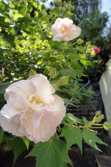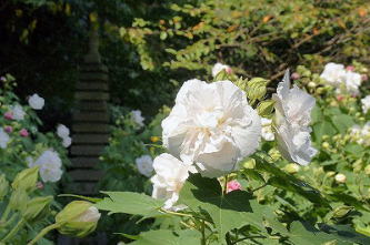 大乗寺(だいじょうじ)は、三条通の日ノ岡から西へ入り、急な坂を登った山の中腹に建つ。近年、本堂を囲むように植えられた「酔芙蓉(すいふよう)の寺」として知られるようになった。 日蓮宗、本能寺の末寺。 ◆歴史年表 創建、変遷の詳細は不明。 江戸時代、1733年、七本松内野(上京区下長者町通七本松西入、鳳瑞町)に建立された。開基は、戒禅比丘隆韶大和尚による。この時、禅宗から法華宗本門流に改宗されたという。(『坊目誌』) その後、無本山の尼寺として法灯は受け継がれた。 200年ほど前、法華宗の大本山本能寺の末寺になる。 近代、昭和期(1926-1989)初期、先代の尼僧・松崎恵浄により、本堂、庫裡が改築され復興された。 20年ほど前、現在地(山科区)に移転する。その後、無住になり、廃寺になりかけたという。 1992年、暮れ、本山執事長だった岡澤海宣(おかざわ かいせん)が入寺し復興が行われている。 1995年以来、酔芙蓉の植栽が始まる。 ◆酔芙蓉 1995年に、住職が吟詠会「吟道宣州流瑛心会」の吟友より、酔芙蓉の苗木100株ほどの寄贈を受けた。以来、境内の整地から始まる。挿し木により株が次第に増やされ、現在では1500株にまでなっている。酔芙蓉がこのように群生しているところは少ないという。 酔芙蓉(アオイ科フヨウ属の落葉低木)の原産地は中国、日本になる。花は、平安時代から観賞されてきた。芙蓉は一重に対して、酔芙蓉は八重咲きの花弁を付ける。さらに花の色が一日のうちに変化する。その色変わりの様が、酒に酔って頬を染めていく姿に喩えられ名付けられたという。 芙蓉の園芸品種だが、突然変異が出にくいため品種が少ないという。9月中旬-10月中旬に花を付ける。一日花で、一日のうちに色に変化が生じる。早朝に淡紅色の花を咲かせ、午後に桃色に変わり、夕方から夜にかけて紅色と次第に濃くなり、翌朝に萎むという。花期後半になると花は小さくなり、一日での変色はなくなる。 ◆歌碑 境内に歌碑が立つ。日蓮上人歌碑「立ちわたる 身のうき雲も 晴れぬべし たえぬ御法(みのり)の鷲(わし)の山風」がある。 小倉百人一首の源宗干歌碑・光孝天皇碑文学碑、京都市詩吟文化連盟各流派建立文学碑、岡澤宣洲(海宣)建立文学碑、酔芙蓉観音の漢詩が立つ。 ◆年間行事 盂蘭盆大法要(8月16日)、酔芙蓉祭(9月15日-10月15日)、紅葉祭(11月末頃)。 *年間行事は中止・日時・内容変更の場合があります。 *年号は原則として西暦を、近代以前の月日は旧暦を使用しています。 *参考文献・資料 『京都市の地名』、『古都歩きの愉しみ』 、『山科事典』、当寺ウェブサイト ![]() ![]() ![]() ![]() |