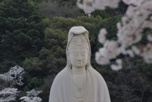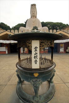 霊山観音教会(りょうぜん-かんのん-きょうかい)は高台寺の南に隣接している。白衣の霊山観音像が東山を背景にして坐す。 家内安全、無病息災、身体健全、病気平癒、交通安全、良縁成就、安産祈願、子宝成就、商売繁盛、事業繁栄、開運厄除、家運長久、受験合格、進学成就、学業成就、就職成就などの信仰がある。 ◆歴史年表 現代、1955年、6月8日、大観音像が建立される。(『日本美術年鑑』)。実業・石川博資は、第二次大戦戦没者・戦争犠牲者の追悼、慰霊のために霊山観音を建立した。 ◆石川 博資 近現代の実業家・帝産グループ創業者・石川 博資(いしかわ-ひろすけ、1891-1965)。男性。秋田県生まれ。父・石川光毅の二男。1916年、南米に渡る。のち中国・東南アジアを巡る。1934年、帝国産金鉱業(伊豆大仁金山)を設立し、1937年、静岡・帝産閣を開業、帝国産金大仁金山選鉱場を開設、北海道・帝国産金興業北ノ王金山を買収した。1946年、東京・帝産オート設立し、GHQ命令により進駐軍事業に従事した。1947年、茨城・愛宕交通を設立、1949年、茨城・帝産オートが愛宕交通を買収し、帝産自動車を設立、1950年、滋賀・帝産湖南交通を設立、広島・帝産オート中国支社運輸を開始した。北海道・帝産函館タクシーを設立、1953年、関西帝産オートを合併した。1955年、京都・霊山観音を建立した。1957年、名古屋・帝産自動車を合併し、1960年、埼玉・帝産オート川越市内路線を東武鉄道に譲渡した。1964年、京都・帝産オートより分離独立し、帝産京都自動車設立した。74歳。 ◆霊山観音 西面した観音坐像は、白衣であり、観音胎内に十二支の守り本尊を安置する。高さは24m(80尺)、顔は6m(20尺)、眉は1.1m(3尺6寸)、目は1m(3尺3寸)、鼻は1.6m(3尺5寸)、口は90cm(3尺)、総重量500t、鉄骨ショットコンクリート打工法。 観音像の下に本堂、内陣があり、本尊・十一面観音が安置されている。仏舎利、境内に護摩堂、願いの玉、縁結びの愛染明王堂などがある。 メモリアルホールに、世界無名戦士の碑がある。 ◆修行体験 坐禅会(8:30-15:00、坐禅・法話・抹茶作法)、写経会(毎月18日、10:00、写経堂、写経・抹茶・菓子、5月は休み)。 ◆年間行事 修正会(1月元日)、節分会(十二支まつり)(2月3日)、初巳祭(3月己巳[つちのとみ]縁日)、彼岸会(3月春分の日)、花まつり(釈尊降誕会)(4月8日)、春季大法要・大護摩祈願(5月18日)、暁天講座(7月2-3日)、水子供養大祭(7月23日)、うら盆会供養(8月13-15日)、万灯会供養(8月13-16日)、彼岸会(9月秋分の日)、萩観賞会(萩まつり)(9月下旬)、祠堂祭(10月1日)、秋季大法要(11月3日)、巳成金(みなるかね)大縁日(11月己巳縁日)、水子供養大祭(11月23日)。 休日・休館(9月に2日間、12月30日午後半日、12月31日)。 *年間行事は中止・日時・内容変更の場合があります。 *年号は原則として西暦を、近代以前の月日は旧暦を使用しています。 *参考文献・資料 ウェブサイト「霊山観音」、ウェブサイト「日本観光史 会社編」 、『京都の歴史10 年表・事典』、ウェブサイト「コトバンク」 ![]() ![]() ![]() ![]() ![]() ![]() |