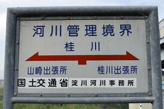 鴨川の終点、最下流では、鴨川は一級河川の桂川と合流している。 鴨川の終わる地点を示すものとして、「河川管理境界」という表示板が立てられている。鴨川と桂川の合流している地点から、数百m、鴨川を遡った東岸の「歩行者自転車専用道路」の傍らにある。 この表示板の右手(北、上流)が、鴨川であり、京都府が管理している。左(南、下流)は桂川となり、国土交通省が管理している。 ただ、地図などの表記では、鴨川の最南端の河口付近までを鴨川としている。 ![]() ![]() ![]() ![]() ![]() ![]() |
