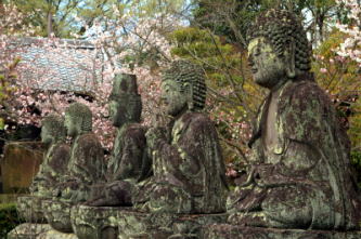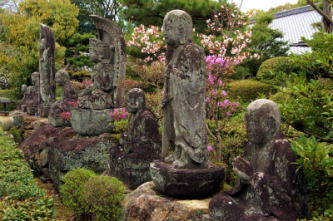 仁和寺の東に五智山蓮華寺(ごちざん-れんげ-じ)がある。 真言宗御室派の別格本山。本尊は、五智不動尊。 近畿三十六不動尊第十五番霊場。 知恵の祈願仏・本尊に因み、学業守護の篤い信仰がある。 ◆歴史年表 平安時代、806年、中国より帰国した弘法大師(空海、774-835) は、広沢池の北西、北嵯峨(現在の、鎌倉時代第91代・後宇多天皇の蓮華峰寺陵) の岩屋の中で、不動明王を石に刻んだという。大師は、きゅうり封じの秘法を残し、開山になったともいう。 1057年、藤原康基(やすもと)は、この弘法大師の不動尊を本尊とし、弥陀、観音などの諸像を安置し、蓮華寺を建立した。広沢の池の西北にあったという。(寺伝) 平安時代、遍照寺の住持・寛朝僧正(916-998) 以来、第64代・円融天皇、第66代・一条天皇、第70代・後冷泉天皇の勅願所になった。以後も、仁和寺奥院として栄える。 鎌倉時代、徳治年間(1306-1308) 、第91代・後宇多天皇により中興され、寺名も「蓮華峰寺(峯) 寺(れんげぶじ) 」と改められる。後宇多法皇は住持になった。 室町時代、1467年、応仁・文明の乱(1467-1477) により焼失している。 その後、鳴滝の音戸山(おんどやま、五智山、165m、現在の宇多野病院裏)山腹に遷されている。後、永らく荒廃した。 江戸時代、1641年、江戸の豪商・樋口平太夫家次により、音戸山に再興される。木食上人但称(但唱)により五智如来などの石仏群像が6年の歳月をかけ造立される。伽藍、堂宇も建立された。尊祐を中興開山とした。仁和寺宮・覚深法親王(後陽成天皇第一皇子) により、「五智山蓮華寺」の号を贈られている。 その後、乗円、雲寂上人らを出して栄えた。御室御所院家として、総法務ノ宮(仁和寺ノ宮) の指南役を務め、六十六部の総本山となる。 その後、焼失する。 近代、1928年、中興18世・大僧正慈海上人により現在地に再興された。 現代、1958年、音戸山に残され損傷していた五智如来5体、虚空蔵、観世音、地蔵菩薩像、聖僧像、単称、平大夫両親、平大夫の像など12体、平大夫の墓碑などが修復され、現在地に遷されている。 ◆尊祐 江戸時代前期-中期の真言宗の僧・尊祐(そんゆう、1645-1717)。詳細不明。男性。俗姓は篠原、字は教算。下野(栃木県)の生まれ。1669年、京都に上り、智積院の運敞(うんしょう)に学ぶ。大和・長谷寺の尊如に師事した。1707年、同寺の能化(のうけ)、1708年、江戸・護国寺で僧正になる。著『科註三論玄義』。73歳。 ◆樋口平太夫 江戸時代の豪商・樋口平太夫家次(?-?)。詳細不明。男性。伊勢(三重県)の生まれ。江戸日本橋に住した。後に発心し入道になり、常信と称した。木食になり、秩父、西国、坂東など諸国霊場を巡る。金札を打ち、国々に納経する六十六部の修行を行った。 総供養に蓮華寺を訪れ、1641年以来、再興に尽力したという。 ◆但称 江戸時代前期の木食僧・但称(たんしょう、?-1641)。詳細不明。男性。但唱、単称。弾誓上人の弟子。諸国遍歴し、仏像2万体を彫刻したという。1641年、蓮華寺の五智如来などの石仏群像が6年の歳月をかけ造立した。61歳?。 墓は江戸・如来寺にある。 ◆伊藤 大輔 近現代の映画監督・伊藤 大輔(いとう-だいすけ、1898-1981) 。男性。愛媛県宇和島市生まれ。松山中学で伊丹万作、中村草田男らと同人誌を発行した。1920年、松竹キネマ付属の俳優学校に入る。初監督作品は「酒中日記」(1924) 、独立し1926年、伊藤映画研究所、1926年日活太秦撮影所に移る。作品には傑作といわれた「忠次旅日記」三部作(1927) 、「下郎」(1927) 、大河内伝次郎の丹下左膳が登場した「新版大岡政談」(1928) 、傾向映画「斬人斬馬剣」「一殺多生剣」(1929) などがある。1933年、新映画社を経て、同年に日活に戻る。1936年、映画監督の伊丹万作、衣笠貞之助、村田実、牛原虚彦らと日本映画監督協会を設立した。「王将」(1948)、傑作時代劇「反逆児」(1961)を撮る。移動撮影を好んだ。脚本家としても活躍した。82歳。 旧宅が御室堅町にあった。墓は蓮華寺(右京区)にある。 ◆片岡 千恵蔵 近現代の俳優・片岡 千恵蔵(かたおか-ちえぞう、1903-1983)。男性。群馬県の生まれ。幼い頃に母親を亡くし、東京市に移る。1912年、9歳で歌舞伎の11代目・片岡仁左衛門主宰の片岡少年劇に入門した。芸名・片岡十八郎、後に片岡千栄蔵を名乗る。1923年、映画「三色すみれ」に出演する。1927年、牧野省三のマキノ・プロダクション御室撮影所に入社した。片岡千恵蔵を名乗り、「万花地獄」で初主演した。1928年、マキノを退社、片岡千恵蔵プロダクションを創立する。「天下太平記」以降多くの時代劇を製作した。1929年、嵯峨野に千恵プロ撮影所を完成する。1937年、千恵プロを解散し、全従業員と日活京都撮影所に入社した。1942年、日活は戦時統合により大映になる。当時の阪東妻三郎、嵐寛寿郎、市川右太衛門とともに「時代劇四大スタア」と呼ばれた。1946年、「七つの顔」の多羅尾伴内役、1947年、東横の「三本指の男」の金田一耕助役が当たる。1949年、東横映画へ移籍した。1951年、東横