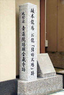 三条通の南に「此付近 青蓮院塔頭金蔵寺跡」の石標だけが残る。この地に、かつて金蔵寺(こんぞう-じ)があったという。青蓮院塔頭であり、その境内の西北に位置していた。「東岩倉金蔵寺」と呼ばれたともいう。(『京羽二重織留』) 天台宗、本尊は地蔵尊(米[よね]地蔵)と呼ばれた。 ◆歴史年表 平安時代、永久年間(1113-1118)、東陽房忠尋の開山による。当初は三条通東にあったという。 中世(鎌倉時代-室町時代)、三条通東より、蛭子町に移ったという。(『山城名跡巡行志』) 江戸時代、1727年、第112代・霊元天皇により白銀1000両を受けて本堂を改めた。 1864年、8月初旬、本堂で坂本龍馬と妻・お龍(鞆)は「内祝言」をあげたという。金蔵寺住職・智足院が仲人をつとめたという。 近代、1868年、廃寺になる。(『京都府地誌』)。本尊、境内の三猿堂が尊勝院に遷されている。 明治期(1868-1912)、境内の蛭子社、恵美須神像は粟田神社の摂社・出世恵美須神社に遷された。 ◆忠尋 平安時代後期の天台宗の僧・忠尋(ちゅうじん、 1065-1138)。通称は大谷座主、号は東陽房。佐渡国(新潟県)に生まれた。源忠季の子。曼殊院に住し、比叡山北谷東陽院に移る。覚尋により出家、西塔に住み、顕密を長豪、良祐に 学んだ。永久年間(1113-1118)感神院新宮(粟田神社)を再興する。1115年、里坊の東山・十楽院を建立した。1118年、権律師、1124年権少僧都、1130年、権大僧都・天台座主、6ヵ条起請を定めた。鞍馬寺を東寺末より延暦寺西塔末寺とした。1131年以降、最勝寺、尊勝寺の結縁灌頂大阿闍梨を務める。1132年、権僧正、1137年、大僧正。門流は東陽院流と称された。著『雑々集』『漢光類聚』など。74歳。 ◆神像 摂社・出世恵美須神社は、かつて三条蹴上の夷谷に祀られていた。源義経 (1159-1189)が奥州下向の際に祈願したという。以来、「出世恵美須」、「門出恵美須」と称された。 室町時代、蹴上の山崩れで社が流出する。社殿が止まったところが現在の三条神宮道付近(東山区夷町)になる。夷町の金蔵寺の境内に蛭子社が祀られ、神像が安置されていた。これは、恵美須社の小祠と神像を寺の境内に遷したものという。 神像は、平安時代、最澄(767-822)作とされる恵美須神像であり、釣り上げた鯛を抱え、口を開けて笑う。日本最古の寄木造の恵美須神という。現在は剥落しているが、当初は彩色されていたという。神像は、1868年に金蔵寺の廃寺に伴い、粟田神社摂社・出世恵美須神社に遷され祀られた。1997年に解体修復が施されている。 ◆米地蔵尊 現在、尊勝院に安置されている米地蔵尊(よねじぞうそん)(100㎝)は、かつて、金蔵寺の本尊だった。平安時代(12世紀)、天台宗の慈覚大師(円仁、794-864)自作ともいわれる。慈覚が遣唐使で渡った際に持ち帰ったものともいう。胎内に籾粒が納められており、米地蔵と呼ばれた。 伝承がある。貧しい女があり、久しく地蔵を崇敬していた。貧窮まった時、地蔵が米袋を持って現れ、貧苦を脱したことからこの名がついたともいう。地蔵尊を信仰すると米の食い逸れがないといわれている。(『山州名跡誌』) 江戸時代の第112代・霊元天皇(1654-1732)も信仰したという。京洛四十八願所地蔵尊の第24番の霊場になっている。 ◆境内社 金蔵寺の境内には、三猿堂(庚申堂、御猿堂)、山王社、蛭子社が祀られていた。 金蔵寺の廃寺に伴い、本尊・米地蔵と三猿堂は尊勝院に遷された。蛭子社に祀られていた恵比寿神像は、粟田神社の摂社・出世恵美須神社に遷されている。 ◆坂本龍馬お龍「結婚式場」跡 石標の正面(北)には、「坂本龍馬お龍「結婚式場」跡」と刻まれている。 NPO法人「京都龍馬会」の説明文によれば、江戸時代末、1864年8月初旬、この地、金蔵寺の本堂で、坂本龍馬(1836-1867)と妻・お龍(鞆)(1841-1906)は「内祝言」を挙げたという。 お龍の父・楢崎将作(1813-1862)が、青蓮院宮尊融法親王の侍医として仕え貞田。その縁により、塔頭・金蔵寺住職・智足院(?-?)が仲人をつとめたという。 *年間行事は中止・日時・内容変更の場合があります。 *年号は原則として西暦を、近代以前の月日は旧暦を使用しています。 *参考文献・資料 『京都・山城寺院神社大事典』 、ウェブサイト「コトバンク」 ![]() ![]() ![]() ![]() ![]() ![]() ![]() |