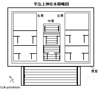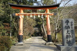 宇治川から東へ坂を登ると、仏徳山の麓に宇治上神社(うじかみ-じんじゃ)はある。かつて、宇治(うちの)神社、また、下社と合わせて宇治離宮明神、離宮明神、宇治鎮守明神、八幡宮とも呼ばれた。槙島(まきのしま)村東部の産土神として祀られていた。 祭神は、本殿左殿(向かって右)に菟道稚郎子(うじのわきのいらつこ)、中殿にその父の第15代・応神天皇(おうじんてんのう)、右殿に兄の第16代・仁徳天皇(にんとくてんのう)が祀られている。 春日神社には、藤原氏の祖先神である天児屋根命(あめのこやねのみこと)が祀られている。 日本最古の現存する神社建築として、1994年、世界文化遺産に登録された。 式内社とされる。平安時代、『延喜式神名式(延喜式神名帳)』(927)中「宇治郡 十座 大五座 小五座」の「宇治神社二座 鍬靫」に比定されている。また、宇治神社とは現在の宇治神社、宇治上神社を指し、ニ座とは菟道稚郎子と母神を意味するともいう。旧村社。 菟道稚郎子は学問の祖神として学業・合格神の信仰を集める。美しい色紙の御朱印(四季折々限定20種類)が授けられる。 ◆歴史年表 創建、変遷の詳細は不明。 古墳時代、この地は、菟道稚郎子皇子の居住した宮跡(離宮桐原日桁宮、きりはらのひげたのみや)といわれている。第60代・醍醐天皇(在位897-930)の時、山城国司が勅により社殿造営したのを始まりとするともいう。 平安時代、927年、『延喜式神名式(延喜式神名帳)』中に「宇治神社二座 鍬靫」と記されている。 1052年/1051年、藤原氏により建立された、平等院の鎮守社として創建されたという。もとは宇治神社と二社一体で、宇治離宮明神(八幡宮)、離宮明神、離宮社とも称された。また、当社は離宮上社、上社、本宮ともいわれ、宇治川下流の中州槇島を氏子域とした。 1060年頃、本殿が建立されたという。 1067年、第70代・後冷泉天皇が離宮神社に神位(位記)を授けたという。(『扶桑略記』) 1104年、藤原忠実が神馬を献じる。 1133年、右大臣・藤原宗忠は、「座女、馬長(うまおさ)、一物(ひとつもの)、田楽。散楽(さるがく)、法のごとし」と当社の離宮祭について記した。(『中右記』) 鎌倉時代、1215年頃、拝殿が建立された。 近代、1883年、当社と宇治神社は分社になる。 現代、1994年、「古都京都の文化財」として、世界文化遺産の一つに指定された。 2003年-2004年、年輪年代測定法による調査で、本殿は平安時代、1060年頃、拝殿は鎌倉時代、1215年に伐採された材を用い、その頃に建立されたと判明した。 ◆菟道 稚郎子 古墳時代(4世紀)の皇子・菟道 稚郎子(うじのわき-いらつこ、?-312)。男性。父・第15代・応神天皇、母・和爾氏の女・宮主矢河枝比売(みやぬしやかはえひめ)。異母兄に大山守皇子(おおやまもりのみこ)、第16代・仁徳天皇(大鷦鶺尊[おおさざきのみこと] )がある。幼少より読書を好む。百済より渡来した学者・阿直岐(あちき)、王仁(わに)に学ぶ。応神天皇の寵愛を受け、兄たちを差し置いて立太子された。応神天皇没後、菟道稚郎子は兄・大鷦鶺皇子に皇位を譲り、自らは宇治に離宮・桐原日桁宮(ひげたりみや)を建て移り住んだ。兄・大鷦鶺皇子も皇位を受けず、皇位継承の混乱は3年に及ぶ。この間に、皇位を巡り、兄・大山守皇子は挙兵した。大鷦鶺皇子はこれを菟道稚郎子に知らせ、自らも皇位を譲りを受けない意志を示した。菟道稚郎子は、菟道川(うじがわ、宇治川)で兄・大山守皇子を討った。菟道稚郎子は入水して自らの命を絶つ。313年、兄・大鷦鶺皇子は仁徳天皇として即位したという。 菟道稚郎子は、『源氏物語』の「宇治十帖」、第45帖「橋姫」、第46「椎本」で登場する宇治八宮のモデルともいう。 墓は宇治川右岸に宇治墓としてある。1889年に宮内省が治定した。 ◆建築 ◈覆屋内の「本殿」(国宝)は西面している。現代、2004年の年輪年代測定法による調査で、平安時代後期、1060年の木材が使われており、本殿は、その頃建立されたとみられている。日本最古の神社建築になる。正面に格子扉、五間社流造、正面桁行5間、梁間母屋2間、庇1間、檜皮葺。内殿は一間社流造で3棟(内殿三社)並び、左右の二殿は背面、片側面、屋根を本殿と共有する形になり、一つの覆屋で繋がれている。覆屋は、正面5間、側面3間の流造。 中央の社殿(中殿)は、ほかに較べ一回り小さく独立し、簡素な造りになる。建造年代は、かつて左殿(向かって右)、中殿、右殿の順に古いといわれていた。左殿と右殿はほぼ同じ様式になる。また、当初、中殿は外(南隣の岩神付近)にあり、その後、覆屋に移されたともいう。ただ、1060年にすでに覆屋は存在した。また、3殿ともに覆屋内に納められていたともいわれている。 蟇股は藤原時代(平安時代中期-後期)の「三名蟇股(ほかに醍醐寺薬師堂、中尊寺金色堂)」のひとつ。奈良時代の板蟇股から、装飾のための平安時代の刳り抜き式(本蟇股)に移行した意匠とされる。蟇股は、左右の輪郭は別の斜材により、内部に両側から蔓状のものが出て中央に蕾状のものを