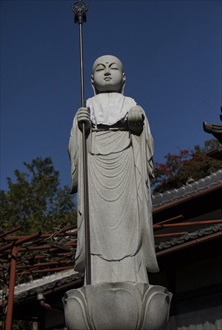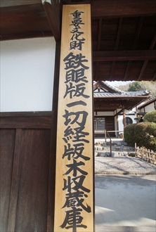 萬福寺の北西近くに、塔頭の宝蔵院(ほうぞう-いん)はある。 黄檗宗、本尊は釈迦牟尼。 ◆歴史年表 江戸時代、1669年、鉄眼道光(てつげん-どうこう)が宝蔵院を建立した。開山は宝洲道聡という。鉄眼は中興ともいう。萬福寺開山・隠元より黄檗山内に寺地を授かり、藏板・印刷所として開かれた。 1673年、大眉性善(だいび-しょうぜん)は、創建した東林庵を宝蔵院に替えた。火災より版木を守るのに適所としたことによる。また、鉄眼が大眉性善より東林庵を譲り受け、宝蔵院を移したともいう。 ◆鉄眼 禅師 江戸時代前期の黄檗宗の僧・鉄眼(てつげん、1630-1682)。男性。俗姓は佐伯、鉄眼 道光(どうこう)、諡号は宝蔵国師。肥後国(熊本県)生まれ。父は、守山八幡宮社僧・佐伯浄信で後に浄土経に入ったという。13歳で真宗・海雲について出家した。豊前小倉・永照寺の西吟に学ぶ。1655年、長崎・興福寺の明の渡来僧、日本黄檗宗の祖・隠元に参じて禅に改宗する。明の渡来僧で長崎・福済寺の木庵性瑫(後に2代・萬福寺住職)、福聚寺の即非如一にも学ぶ。その後、隠元に付いて摂津・普門寺、山城国・萬福寺に移る。1664年頃、日本に一切経版木の無いことを憂い、1668年、一切経の木版刷りによる開版を決意する。1669年、隠元にその志を告げると、隠元は明朝版『大蔵経(万暦版大蔵経、16世紀後半-17世紀)』を贈った。黄檗山境内に藏版・印刷所になる塔頭・宝蔵院を建立し、京都の木屋町通二条に「印房」(後の貝葉書院)を設けた。ここでは、版木の彫刻、経本の製本、頒布が行われた。事業には100人の法兄、弟子たちが携わった。その後、鉄眼は江戸に資金を募る旅に出る。各所で『楞厳経(りょうごんきょう)』などの講経活動を行い、募金を集めた。口頭禅の実践に対し、各所で真宗教徒による妨害も行われた。1670年、大坂に薬師堂を興し、瑞龍寺(鉄眼寺)の中興開山になる。1673年、大眉性善(だいび-しょうぜん)より、黄檗山内の塔頭・東林庵を譲り受け、宝蔵院を移した。1676年、木庵の法嗣になる。1678年、17年の歳月をかけ初刷が完成し、後水尾法皇(第108代)に進上した。400部が印刷され、各地の寺院に配布された。1681年、『本刻(鉄眼版[黄檗版])大蔵経)』6900余巻が完成する。1682年、畿内で大飢饉が起り、募金と2万人/1万人への救済事業を行う。その活動の途上で倒れ亡くなる。女性に向けて法を説いた『鉄眼禅師仮名法話』を著した。ほかに『鉄眼禅師遺録』。53歳 「活仏」と仰がれ、荼毘に付された日には、鉄眼を送る人々の数は10万人を超えたという。 ◆宝洲 道聡 江戸時代前期-中期の黄檗宗の僧・宝洲 道聡(1644-1719)。詳細不明。男性。1669年、萬福寺・宝蔵院の開山になる。75歳。 ◆大眉 性善 江戸時代前期の黄檗宗の渡来僧・大眉 性善(だいび-しょうぜん、1616-1673)。男性。俗姓は許。福建省の生まれ。隠元隆琦(いんげん-りゅうき)について出家した。1654年、隠元に従い来日し、長崎・興福寺、崇福寺、摂津・普門寺、萬福寺に移る。隠元の法嗣になる。著『東林大眉和尚夢語』。58歳。 ◆一切経 一切経は漢文で仏教経典一切を集めている。経文は、古来インドで生まれ、梵文で書かれた。唐代の中国の訳経僧・三蔵法師(602-664)は、これを中国語に訳している。 一切経は、大蔵経、蔵経ともいわれる。中国における仏教経典の総集であり、経蔵(釈迦の教え)、律蔵(戒め)、論蔵(注釈、解釈集)から成る。 隠元は、日本にも一切経の版木が欲しいと考えていた鉄眼に、所有していた一切経を授けた。鉄眼は全国行脚して寄付を募り、江戸時代前期、1681年に版木を完成させた。覆刻した万暦(ばんれき)本は、明の万暦年間(1573-1620)に、柴柏大師、弟子の密蔵禅師により20年以上の歳月をかけて北蔵を改刻したものだった。全巻で6956巻あり、仏教百科事典ともいわれている。 ◆文化財 「鉄眼版一切経版木」全6956巻(重文)がある。版木の材は、吉野桜(ヤマザクラ)を使用している。縦26cm、横82cm、厚さ1.8cmで、周辺に3cmの縁がある。 版木の書体は明朝体であり、中国明時代に底本がある。現在も広範に使われている書体の起源になり普及した。また、一行20字、10行が見開きになっており、これは400字詰原稿用紙の原形といわれている。 一枚の片面の版木には、この400字詰が2面4頁分(1600字)刻されている。また、裏面も同様で、一枚の版木両面には4面8頁分(3200字)が刻されている。このような「黄一切経」の版木が、全部で6万枚あり、そのうちの4万8275枚が重文指定されている。 明の「万暦蔵」の復刻、「続蔵経」26巻も納めている。 現在もなお、版木収蔵庫の一角で、版木を用いて、経本の印刷(木版印刷)、出版が行われている。木版印刷は、それまでの写経に変わり、大量印刷を可能にした。初刷より現在まで、約2000部が印刷され各宗派にも届けられたという。近代以降は、国内のみならず世界各国に納められている。 版木収蔵庫の厨子内に、鉄眼禅師像が安置されている。 ◆建築 本堂裏の墓地にある江戸時代前期建立の開山塔(168