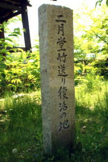 ![]() ![]() ![]() ![]() ![]() 境内の池泉 ![]() 「二月堂竹送り復活の地」の石標 |