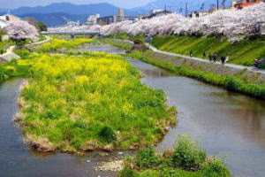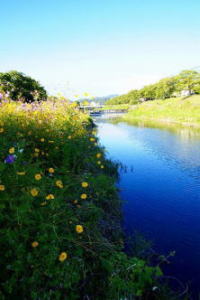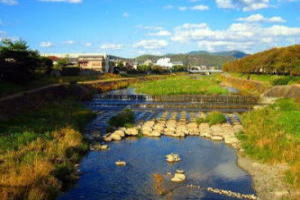 鴨川の支流一つである高野川(たかの-がわ)は、淀川水系の一級河川で、若狭街道(朽木街道、鯖街道)に沿い、大原、八瀬、上高野、山端を流れ、下鴨の糺の森で鴨川に合流している。 ◆歴史年表 平安時代、上高野、松ヶ崎でも禊が行われていた。 799年、「禊於埴川」の埴川(はにかわ)とは、高野川といわれている。(『日本後記』巻8) 江戸時代、1686年、「高野川と号す」と記されている。(『雍州府志』) 近代、 1919年、3月30日、高野川改修工事が竣工する。(「京都日出新聞」) 1935年、昭和10年鴨川大洪水で、高野川沿いでも被害が出た。 現代、戦後も反物の友禅流しも行なわれていた。 ◆源流・支流 高野川は、流路延長23km、流路面積46.6㎢ある。 源流は、京都市左京区と滋賀県大津市の境にある途中峠の南西にある。焼杉山の北・古知谷阿弥陀寺の北を流れる谷川、天ヶ岳北東から流れる高谷川、三千院の東・小野山を源にする呂川、焼杉山の南を源とし、寂光院の脇を流れる草生川、さらに宮川、大長瀬川などいくつかの支流の流れを集め、南西方向に流れ下る。さらに、上高野の花園橋下流で岩倉川と合流し、松ヶ崎橋の上流で音羽川と合流し、出町柳の賀茂大橋上流で鴨川と合流する。 主な支流としては、高谷川、 呂川、(律川)、草生川、大長瀬川、宮川、岩倉川、音羽川、分流に 泉川がある。 ◆高野の由来、歴史 高野川の高野は、平安京遷都の際の、「御狩野」の「鷹野」に由来する。近くにいまも氷室山(上高野)の名があり、この山にはかつて氷室があったともいう。小野官瓦窯跡もあり、高野は平安京との関わりが深い。 高野川は、大原の里では「大原川」、八瀬では「八瀬川」、また「埴川(はにかわ」(『日本後紀』、840)とも呼ばれた。埴川の「埴」とは、粘土(赤土、はに)を産したことによる。焼き物の材料になり、衣料の土染めにも使われた。 高野川は水深が浅く、流れは清涼で、平安時代には上高野、松ヶ崎でも禊が行われていた。かつては禁河とされ、アユは天皇に供されていた。 なお、高野川河畔に建立されている崇道(すどう、崇導)神社に祀られている高野新笠(桓武天皇の母)は、百済武寧王の系譜をひき、後に高野朝臣になったことから高野姓の由来になった。 江戸時代の『雍州府志』(1684)には、「叡山の麓を過ぎて、高野村に出ず。依りて、高野川と号す」とある。高野村が高野川の名前の由来としている。 かつて高野川沿いでも友禅業が盛んで、戦後も反物の友禅流しも行なわれていた。 近代、「昭和10年鴨川大洪水」(1935)では、高野川沿いでも被害が出ている。その後の改修工事において、急曲部の緩和、護岸工事、幅員拡大などが行われている。 ◆水争い 江戸時代には、高野川、音羽谷川、大田川から、周囲の村々に水が引かれていた。高野川沿いの大原から八瀬にかけては、40カ所の井堰があった。 そのなかで、太田井堰は、周辺の高野、修学院、一乗寺、田中の村と、下流の松ヶ崎、下鴨の6村の水田の灌漑に利用された。そのため、上流の組合井堰をめぐり、下流の村との間で、分水量、分水方法をめぐる長期の争いが絶えなかった。 旱魃の際に農民は、田畑が「亡所」となることを恐れた。このため、京都町奉行所への訴訟も度々で、時には太田井堰、松ヶ崎井出ヶ鼻井堰の破壊も行われた。また、井堰の維持管理のための普請も、農家にとっては負担が大きな作業だった。300年にもわたる水争いは、近代、明治期になって終焉している。 ◆名石 名石として知られ、庭石として重宝された「加茂の七石」の一として、高野川で産した「八瀬真黒石」がある。 ◆文学 歌人・与謝野晶子(1878-1942)に「高野川 河原のかなた 松が枝に かはせみ下りぬ 知る人の家」(歌集『舞姫』、1890年)がある。 ◆自然 近年、5月下旬-6月中旬に、河合橋の泉川流入口付近、さらに上流部でも、わずかながらゲンジボタルの飛翔が確認されている。 国の特別天然記念物、オオサンショウウオが棲むともいう。 ◆アニメ アニメーション『けいおん!(第1期)』『 けいおん!!(第2期)』(原作・かきふらい 、制作・京都アニメーション、第1期2009年4-6月、第2期2010年4月-9月、第1期全14話、第2期全27話)の舞台になった。高野橋東詰、高野川河川敷などが登場する。 *年号は原則として西暦を、近代以前の月日は旧暦を使用しています。 *参考文献・資料 『京都大事典』、『高野川』、『京都の歴史10 年表・事典』、ウェブサイト「アニメ旅」 |