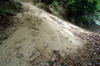 ![]() 「白幽子厳居之跡」、現在は屏風岩とその前にわずかな敷地跡のみが残っている。 ![]() 富岡鉄斎揮毫による「白幽子巌居之蹟」の七字、現在は字の一部が抉られている。 ![]() 山中にある「白幽子厳居之蹟」への道標 ![]() 白幽泉、いまもわずかに湧水している。 ![]() 泉近くの石垣、石工関連の小屋跡?。 ![]() 切り出された石材が山中に置かれたままになっている。 ![]() 石柱状のもの。 ![]() 燈籠の基礎、返花部分。 ![]() ![]() 白川砂、山の斜面に砂が流れ出している。瓜生山 ![]() 清沢、川底に白川砂が堆積している。 |