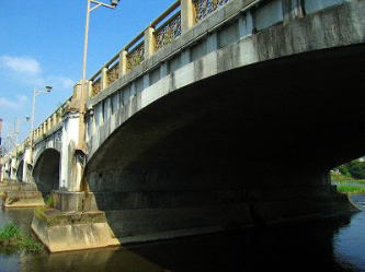 現在の七条大橋(しちじょう-おおはし)は、鴨川に架かる現存の橋の中ではもっとも古い。土木学会により土木遺産に認定されている。 ◆歴史年表 平安時代、七条通は平安京の七条大路にあたる。西の端は山陰街道に通じていた。七条大路には、東西の市が面し、門前には市姫の社(市比姫売神社の前身)が祀られていた。 江戸時代、七条河原には、中州を挟んで2つの橋が架けられていた。その後、1本の七条橋になる。 1654年、鴨川に架かる11の橋の一つとして七条口(七条橋)の記載がある。(『新版平安城東西南北町井洛外之図』) 1670年、京都所司代・板倉重矩の寛文の新堤築造により、後に鴨川西岸高瀬川との間、五条(1761年の五条新地)-七条(1717年の七条新地)に遊郭が生まれた。 近代、1871年より、京都府は橋の修繕費として地車1両につき50文の通行料を徴収した。 1911年、11月、現在の橋が着工する。 1913年、3月、現在の橋が市電事業に伴い架橋された。 1935年、鴨川大洪水では、橋の流出はなかった。護岸が破壊されている。 太平洋戦争(1941-1945)中、波模様の高欄、照明灯が金属供出により一度撤去される。 現代、1978年、最後まで残っていた市電の七条線(東山七条-京都駅間)が廃止された。 1979年-1987年、京阪電車、琵琶湖疏水の地下化工事が行われる。橋長が112.8mより82mに減じた。 1986年、木造高欄より現在の高欄デザインに修景された。 2008年、土木学会は選奨の土木遺産に認定される。 2019年、3月29日、国の登録有形文化財に指定された。 ◆板倉 重矩 江戸時代前期の大名・板倉 重矩(いたくら-しげのり、1617-1673)。男性。幼名は長命、通称は又右衛門、内膳正(ないぜんのかみ)。父・板倉重昌(しげまさ)、母・林吉定の娘の長男。1637年、島原の乱で父・重昌と共に九州へ赴く。重昌は戦死し、重矩は戦功を上げる。軍律に違反し一時逼塞させられた。1639年、三河(愛知県)深溝(ふこうず)藩主・板倉家(2代)を継ぎ、三河中島藩主に転じた。大坂定番を経て1665年、老中になる。1668年-1670年、京都所司代になる。1669年、鴨川に寛文新堤を築いた。1670年、老中に再任される。1672年、下野(しもつけ)(栃木県)烏山藩主・板倉家初代になる。57歳。 所司代として朝廷からも厚い信任を得ていたという。 ◆柴田 畦作 近現代の建築家・柴田 畦作(しばた-けいさく、1873-1925)。男性。岡山県の生まれ。1896年、東京帝国大学工科大学卒。九州鉄道会社技師になる。後に、第3高等学校教授、第5高等学校教授を経て、東京帝国大学工科大学助教授、教授になる。 ドイツ、フランス、アメリカ合衆国に留学した。1905年、工学博士の学位を受けた。国内で初めて鉄筋建築を研究し、応用力学・構造学に造詣深く、本格的な「鉄筋コンクリート建築の祖」といわれた。 設計に福島県原町市の鉄筋無線送信所主塔、京都の近代化の礎になった「三大事業計画」の道路拡幅、市営電気軌道敷設に関する研究にも関わった。四条大橋、明治神宮の神橋、東大本郷キャンパス理科大学化学教室なども設計している。53歳。 ◆森山 松之助 近現代の建築家・森山 松之助(もりやま-まつのすけ、1869- 1949)。男性。大阪の生まれ。外交官・貴族院議員・森山茂の子。学習院、攻玉社を経て、1893年、第一高等学校を卒業後、1897年、東京帝国大学工科大学建築学科を卒業し、大学院に進学した。1898年、第一銀行建築係嘱託になる。1900年、東京高等工業学校の建築学講座担当した。1906年-1921年、台湾総督府営繕課技師になる。1912年、欧米などの視察を行う。帰国後、1922年、森山松之助建築事務所を開設した。 現存する作品としては、1908年の台北水道水源地喞筒室(自來水博物館)(市定古跡)、1924年の東京・久邇宮邸(聖心女子大学パレス ) (重文)、1929年の諏訪市・片倉館会館・浴場・渡廊下(重文) などがある。79歳。 ◆山口 孝吉 近代の建築家・山口 孝吉(1873-1937)。男性。1897年、東京帝大工科大学造家学科を卒業した。1900年、文部省建築課嘱託になり、帝大の建設に携わる。1907年、東京帝大技師になった。1912年、初代の営繕課長として帝大校舎を手掛ける。現存作品に東大の理科大学科学教室(化学教室東館)がある。64歳。 ◆七条大橋 現在の七条大橋の架設年は近代、1913年になる。「京都三大事業」に伴い、「道路拡張および市電敷設」事業の一環として架橋されている。鴨川に架橋された橋の中で、近代、明治期の意匠を残す唯一例であり、鴨川に架かる最古の橋になる。現代、2008年、土木学会により土木遺産に認定される。2019年に鴨川に架かる橋中で、明治期の意匠を残す唯一のコンクリート・アーチ橋として国の登録有形文化財に指定された。 橋種は、黎明期のRCアーチの中でも、群を抜いて巨大な橋になる。当初の橋長は112.2mあり、その後、京阪電鉄の地下化、鴨川運河の暗渠化により減じた。基礎に一橋脚当たり末口20㎝、長さ2mの松杭250本が打込まれている。 設計は、東京大学教授・柴田畦作(1873-1925)による。意匠は森山松之助、山口孝吉による。橋のデザイン様式は、四