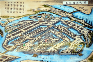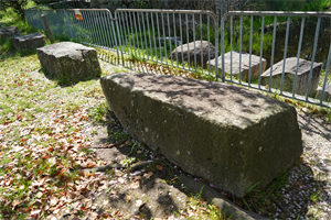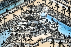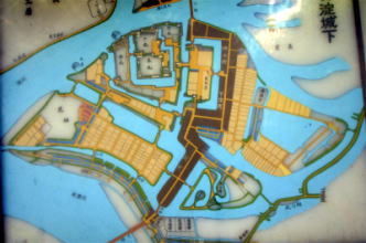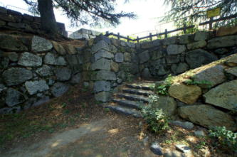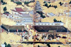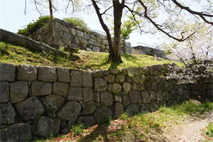 ![]() ![]() 本丸石垣と内堀、割石を使っている。 ![]() ![]() ![]() 「淀水車」跡 ![]() 淀城、淀川の水車、淀城公園内の説明板より ![]() サクラ ![]() サクラ ![]() ![]() ![]() 天守台 ![]() 天守台 ![]() 天守台、近年に発掘された。天守にはこの部分の穴蔵(地下室)より入った。基底の礎石は39個による。上から見ると四方形のロノ字の空間に入口(手前)が付いている。 ![]() ![]() 掘、南側から見た天守台 ![]() 掘、天守台 ![]() 本丸下の石垣、自然石を積み上げている。 ![]() 山城国淀城図、淀城公園内の説明板より ![]() 山城国淀城図、淀城公園内の説明板より ![]() ツツジ ![]() 石垣の家紋 ![]() 石垣の家紋 ![]() 矢穴跡 ![]() 北西隅の三重櫓跡、丹波櫓の檜台石垣 ![]() 「明治天皇御駐蹕(ちゅうひつ、一時滞在)之址」 ![]() 淀城下図、公園内の説明板より。左上(北)に淀川、右上に宇治川、左上に桂川、左下に木津川が合流し、城郭は自然の外堀に囲まれていた。中央やや上の三角地帯中央に本丸、その上に二ノ丸、右に三ノ丸、本丸左に西ノ丸、本丸右に東曲輪、南西に内高嶋、周囲に侍屋敷(黄土色部分)、町屋(茶色部分)が広がっていた。 城下町は、「淀六ヶ町」があり、城内3町、城外3町に分けられていた。橋は上(北)に小橋(淀小橋)、南に大橋(淀大橋)が架けられていた。京都から大坂へ向かうには、宇治川に架かる淀小橋により城下に入り、木津川の淀大橋を渡って抜けた。 ![]() ![]() 【参照】二条築城当初の天守、場所は現在の二条城内清流園付近(「洛中洛外図六曲屏風一双」)、京都市の案内板より 淀城跡公園(中央)、淀川(左上)、OpenStreetMap Japan ![]() イチョウの大木 ![]() モミジ ![]() モミジ ![]() 石標「淀城之故址」 ![]() 「淀小橋旧跡 従西南大坂至」の石標(現在はない) ![]() 「唐人雁木旧跡」の石標(現在はない) ![]() 稲葉神社脇にある石、丸二の紋の刻印がある。 ![]() 「田邊治之助君記念碑」 ![]() クスノキの巨木 ![]() 淀城の鯱瓦(京都市考古資料館-京都市埋蔵文化財研究所蔵) |