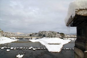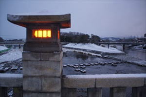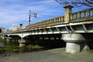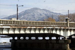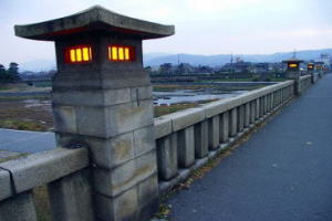 今出川通に架かる賀茂大橋(かもおお/かもおほ-はし)は、西からの鴨川と東からの高野川の合流点、三角州・糺の森のすぐ下流に位置している。 橋の上からは、北には北山、西に比叡山、大文字山、東山の峰などを一望することができる。 橋の東にある大文字山は、「山当て」といわれる景観手法が用いられている。これは視線の先に山がくるように、通りの方向を定めた古来からの都市計画の一つになる。 ◆歴史年表 南北朝時代、1353年、疫病が流行り、糺河原に8万4000基の石塔が立てられ病平癒を祈願する。 室町時代、1464年、鞍馬寺の塔建立のため、糺河原で勧進能が催され、将軍・足利義政・日野富子・大名らも参列した。(『糺河原勧進猿楽日記』) 江戸時代、1645年、干菜山光福寺の八幡宮再建のため、糺河原で勧進相撲が催された。(『古今相撲大全』) 1654年、『新版平安城東西南北町井洛外之図』には、大原口(賀茂大橋)の記載がある。 近代、木橋が架かり、「出町橋」、「今出川橋」とも呼ばれていたという。 1931年、近代の建築家・武田五一の意匠設計により現在の橋が架けられる。7月10日、渡初式が行われた。(「京都日出新聞」) 1935年、6月、「鴨川大洪水」では流失しなかった。 現代、1981年より、夜間に欄干の14基の石灯籠(ナトリウム灯)に灯りが入る。 ◆武田 五一 近代の建築家・建築学者・武田 五一(たけだ-ごいち、1872-1938)。男性。備後福山(広島県)の生まれ。父・備後福山藩士・司法官・平之助(直行)、母・八重の第5子。父の赴任に従い、神戸、姫路、岐阜、高知に住む。1888年、京都第三高等中学校補充科に入学した。1894年、京都第三高等中学校本科を卒業し、京都帝国大学工科大学造家学科に入学する。1897年、帝国大学(東京帝国大学)造家学科(建築学科)を首席卒業し、同大学院に進学した。1899年、大学院中退後、東京帝大助教授に任じられる。東京高等師範学校講師嘱託、東京美術学校教官になった。1901年-1903年、文部省より命じられ欧州留学する。ロンドン・カムデン美術学校で学び、各地を巡る。アール・ヌーボー、セセッションなどを体験する。1903年、帰国後、京都高等工芸学校(現・京都工芸繊維大学)図案科教授になる。1904年、京都府技師を兼任し、平等院鳳凰堂・鹿苑寺金閣の保存に関わる。1907年、東京・福島行信邸で、日本初のウィーン・セセッションの様式を試みた。アール・ヌーボーの造形を紹介する。1908年、大蔵省臨時建築部技師を兼任し、国会議事堂建築のために欧米視察した。1912年、パナマ太平洋万国博覧会事務取扱嘱託になる。1915年、工学博士学位を取得する。勲四等瑞宝章を受賞した。1916年、法隆寺壁画保存会委員になる。1917年、片岡安らと「関西建築協会」を設立する。1918年、名古屋高等工業学校(現・名古屋工業大学)校長に転任した。1920年-1932年、京都帝国大学建築学科創立に伴い教授になる。1925年、大蔵省営繕管財局技師を兼任した。1929年-1931年、京都帝国大学営繕課長事務取扱として学内建築物の造営に関わる。1931年、欧米出張し、19カ国を訪れた。1934年以来、法隆寺大修理工事事務所長を務める。65歳。 「関西建築界の父」といわれた。奈良・京都の古社寺保存修復、橋梁、博覧会場、公園、記念碑、都市計画、街路施設、家具意匠、染色なども手掛けた。主な作品として、旧日本勧業銀行本店(1899) 、日本初のセセッション建築とされる東京・福島邸(1907)、京都府立図書館(1909)、京都・円山公園(1912)、京都・同志社女子大学ジェームス館 (1913) 、京都・旧松風嘉定邸 (現・五龍閣、1914)、山口県庁舎・県会議事堂(1916) 、大阪・瀧安寺鳳凰閣(1917) 、兵庫・清水寺根本中堂・大講堂・本坊・客殿(1917) 、東京・旧村井吉兵衛邸(現・延暦寺大書院、1919) 、 兵庫・清水寺鐘楼 (1919)、兵庫・光明寺根本本堂(1925) 、 和歌山・高野山大学図書館 (1928)、代表作の東方文化学院京都研究所(1930)、京都・同志社女子大学栄光館(1932) 、鳥取・三朝大橋(1934年) など多数。葵橋、賀茂大橋なども設計した。 ◆賀茂大橋 現在の賀茂大橋の架設年は近代、1933年になる。意匠設計は、近代の建築家・武田五一による。石製高欄、歩道燈籠など和風意匠が取り入れられている。 橋種は8径間ゲルバー鋼プレートガーターであり、流水部の中央の4径間はゲルバー式鋼板桁、両端の2径間は、単純桁が組み合わされている。石灯篭の高欄などの一部は石造になっている。石燈籠の欄干は全部で14基あり、現代、1981年からナトリウム灯が点灯されている。 橋長は鴨川に架かる橋の中で最長の141.4m。橋の幅は22m/23.2mある。路線名は銀閣寺宇多野線。 ◆鴨川 鴨川(かもがわ)は加茂川、賀茂川とも表記されている。三角州で加茂川、高野川が合流し鴨川になる。公的には鴨川で統一されている。 ◆三角州 鴨川と高野川の合流点である出町三角州は、「糺河原」、「出町剣先」、「鴨川デルタ」などとも呼ばれる。 この付近は、洛中と洛外の境に位置し、京の七口の要所の一つになっていた。二川の水運の要衝地