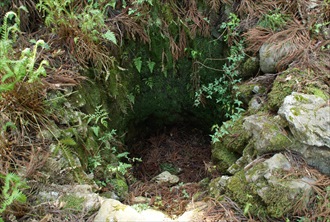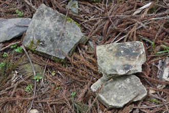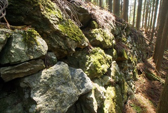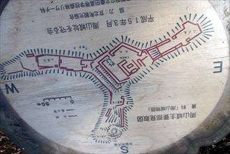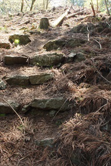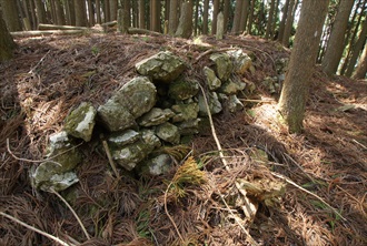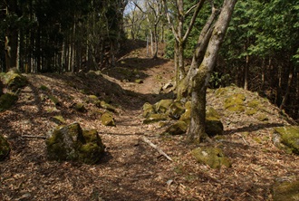 ![]() 案内の道標「京北十景 周山城址」とあった。山頂までの案内は詳しい。 ![]() 北山杉林の中の山道 ![]() 本丸の東、出丸的な小規模の石垣、土留めになっている。 ![]() 二の丸、削平部分 ![]() 石段 ![]() 東の城の虎口、本丸登城口は尾根を利用しており上り坂になっている。突きあたりが本丸になる。 ![]() 登城口にあった瓦片。 ![]() 本丸 ![]() 天守台の石垣 ![]() 本丸の窪地、周囲には石垣が積まれている。 ![]() 現地にある説明板、東西が逆になっているため、地図を反転している。上が北になる。 赤い線の部分が石垣で、緑の線の部分が盛り土・土塁。通常の登山口から上ると右手から入る。東端(右端)に「二ノ丸」、中央部分が東の城の「本丸(主郭)」、南に「鷹屋ノ丸」「馬屋ノ丸」、西に「小姓丸」と呼ばれる郭がある。本丸と西の郭の付け根部分に、虎口が見えている。 ![]() 井戸跡、開口部は1.5mほど。 ![]() 本丸南西尾根の郭 ![]() 本丸西の郭 ![]() 西方端の郭石垣、野面積み(3m)が良好に残っている。 ![]() 本丸西の石垣、石材はチャート、自然石の野面積による。 ![]() 城山より樹間の北の眺望、日本海の小浜に続く周山街道(国道162号線)が見えている。 ![]() 本丸西にある堀切の一つ、尾根部分をかなり深く掘り込んでいる。 ![]() 【参照】栗尾峠からの京北の町、桂川 |