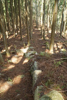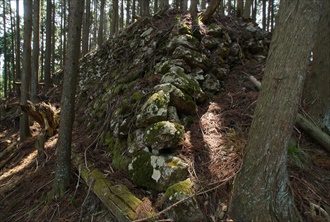 京北周山町の西に位置する黒尾山(標高509.4m)の東峰、城山(標高480m)の山頂付近一帯の杉林の中に、山城・周山城(しゅうざん-じょう)の遺構が残されている。明智光秀が築城し、ほぼ築城時の状態で残されている。 城は桂川と弓削川の合流地点の西、山の頂にあり、南北に走る周山街道(西の鯖街道)を一望することができる。周山の名は、光秀が名付けたという。 ◆歴史年表 安土・桃山時代、1578年、明智光秀は亀山城を築城する。 1579年、明智光秀の丹波攻略により宇津(うづ)城は開城する。同年/1579年-1581年、周山城が築城されたともいう。 1580年/1581年頃、明智光秀は宇津氏らの土豪と、京都と若狭を結ぶ周山街道の抑えのために周山城を築く。明智光忠を城主に配した。 1581年、旧8月、光秀は、茶人・津田宗及とともに、山上の本丸天守で十五夜の月見の茶会を催した。(『津田宗及茶湯日記』) 1582年、本能寺の変後、光秀の死後に、城は光秀残党により焼かれ廃城になったという。また、羽柴(豊臣)秀吉の持ち城になり、加藤光泰が城代として入城したともいう。 1584年、旧2月、秀吉が城を視察したという。(『兼見卿記』)。この頃まで、城は秀吉配下の武将により使用されていたともいう。 天正年間(1573-1592)、廃城になったとみられている。 現代、2017年度より、京都市は調査を行う。 2024年、京都市は、城門跡を発見したと発表した。 ◆明智 光秀 室町時代後期-安土・桃山時代の武将・明智 光秀(あけち-みつひで、1528?-1582)。男性。名は十兵衛、惟任日向守(これとうひゅうがのかみ)。美濃(岐阜県)の生まれ。父・明智光綱。美濃の土岐氏支流ともいう。娘は細川ガラシャ。初め斎藤氏に仕えた。越前・朝倉義景に仕え、1566年、織田信長に仕えた。1567年、滝川一益に従い北国征伐に加わる。1568年、信長入京に当たり、政務に当り足利義昭のために公家側に働きかけた。1569年、公家寺社領仕置などに携わる。信長と義昭の対立を仲介する。1570年、信長の摂津、近江の出陣に従う。1571年、近江・坂本城主になる。1572年、浅井氏の小谷城包囲に参加する。1573年、越前朝倉氏攻略に加わった。1574年、大和多聞山城を守備し、美濃、河内に転戦した。1575年、功により惟任日向守と称した。信長の命で丹波の攻略に着手し、福知山城を築城した。年貢を軽減するなど民に慕われた。1577年頃、亀山城を築造する。1579年、強く抵抗した八上城の波多野秀治らを下して丹波平定した。福知山と命名、城を改修する。1581年、因幡鳥取城攻めに羽柴(豊臣)秀吉を援け、丹後の検地を断行する。1582年、甲州・武田勝頼攻撃に従う。信長より徳川家康の慰労を命じられ、さらに、秀吉の備中高松城包囲に救援を命じられる。光秀は反発し、亀山城(亀岡市)に入り、愛宕山に詣り謀反を決意した。備中出陣の名目により、6月1日、兵1万3000を率い、亀山城を発した。老ノ坂で天下取りを表明する。2日、本能寺を急襲し、信長を自刃に追い、二条御所の信忠を自滅させた。(本能寺の変) 。13日、取って返した秀吉との山崎の戦いに敗れる。一旦、勝竜寺城に入る。坂本城に落ち延びる途中、小栗栖(おぐるす)で土民の襲撃により傷を負い、自刃して果てたという。「三日天下」といわれた。故実、典礼に通じた。法名は秀岳宗光。56歳。 1578年、光秀はこの地周山を訪れている。北桑南部では、宇都(宇津)右京大夫が四代に渡り支配し、暴力による悪政を敷いていたという。1579年、光秀は宇都(宇津)城を攻め、戦うことなく降伏させる。戦略拠点にするため、城の修復を急いだ。この際に、周辺の神社仏閣の石垣や墓石も徴用 し、資材として使ったという。城は、周山城と名付けられた。また、亀山にも別の城郭を構えた。 ◆明智 光忠 室町時代後期-安土・桃山時代の武将・明智 光忠( あけち-みつただ、1540-1582)。男性。通称は次右衛門、二郎、二郎四郎。父・明智光久(明智光秀の叔父)。光秀の従弟。妻は光秀の2女、父とともに光秀に仕えた。光秀の城攻略に伴い、1577年、亀山城に留守居として入る。1579年、丹波八上城の落城で城代として入城した。1580年/1581年頃、周山城の城主になる。1582年、6月、本能寺の変で二条城を攻め、鉄砲で重傷を負い知恩院で療養したという。山崎の戦いで、敗戦を知り近江・坂本城で一族とともに自害した。剃髪し、長閒斎(ちょうけんさい)と号した。43歳。 明智五宿老の一人。 ◆津田 宗及 安土・桃山時代の豪商・茶人・津田 宗及(つだ-そうぎゅう/そうきゅう、?-1591/1592)。男性。隼人、屋号は天王寺屋、通称は助五郎、更幽斎、道号は天信。堺の生まれ。父・豪商・津田宗達の嫡男。天王寺屋の3代目を継ぐ。畿内の武将、本願寺坊官・下間氏などと関係した。茶を父・宗達、武野紹鴎(たけの-じょうおう)に学び、後に織田信長・豊臣秀吉に仕え、御茶頭(おさどう)になる。1558年、名物茶入の切型を作る。政商として畿内・九州で活動したとみられる。山城宇治に領したという。1566年より、宗及と改称した。1568年、信長の入洛後に信